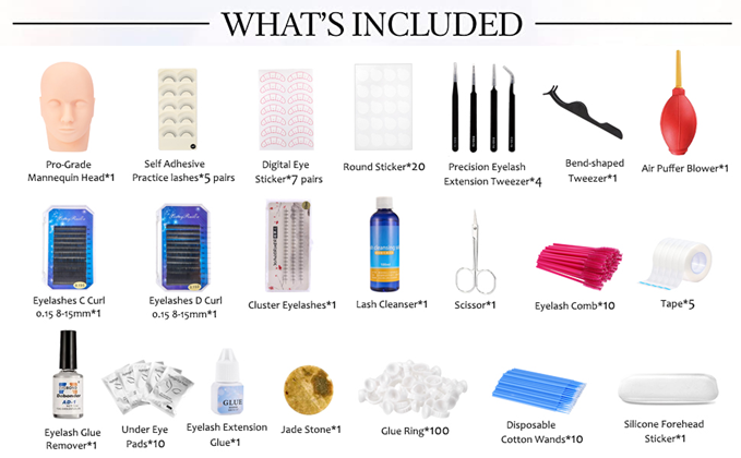 • EYELASH EXTENSION PRACTICE KIT WITH EVERYTHING - This lash extension kit with everything is useful for beginners or anyone who has a growing interest in doing lashes. Mannequin head, practice lashes, lashes extension, lash brush, swab, tweezers, eyelash gel patch, glue, glue remover, eyelash tape, eyelash cleansing solution, silicone pad, glue stickers, jade stone, air puffer blower, scissors, lash positioning stickers and glue rings.
