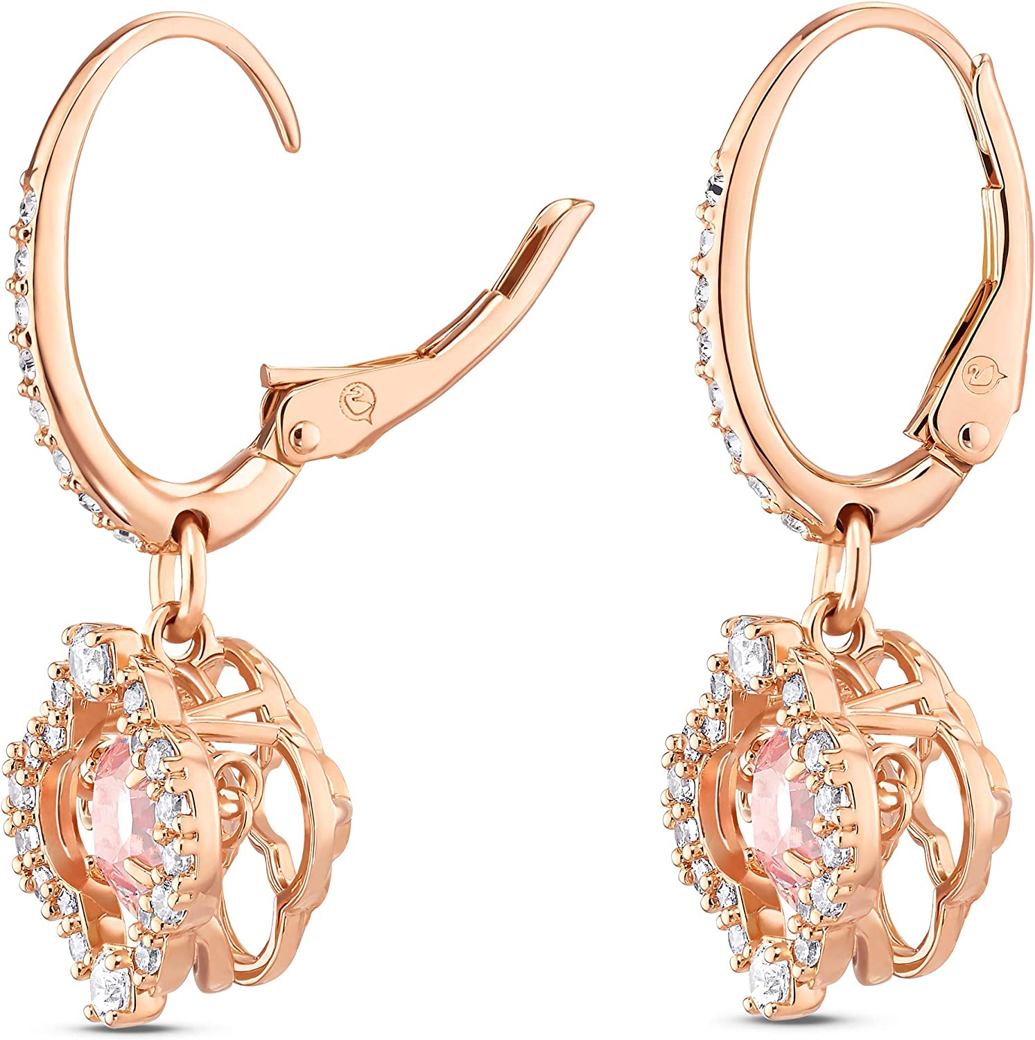 Items delivered: 1 x set of Swarovski Sparkling Dance hoop pierced earrings for women with pink stones surrounded by clear crystal pavé in a rose-gold tone plated setting, with Swarovski earring box