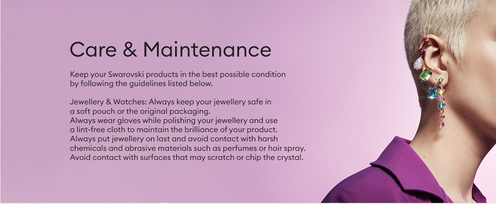 Designed to last: Swarovski jewelry will maintain its brilliance over time when simple care practices are observed; remove before contact with water, lotions or perfumes to extend your jewelry's life