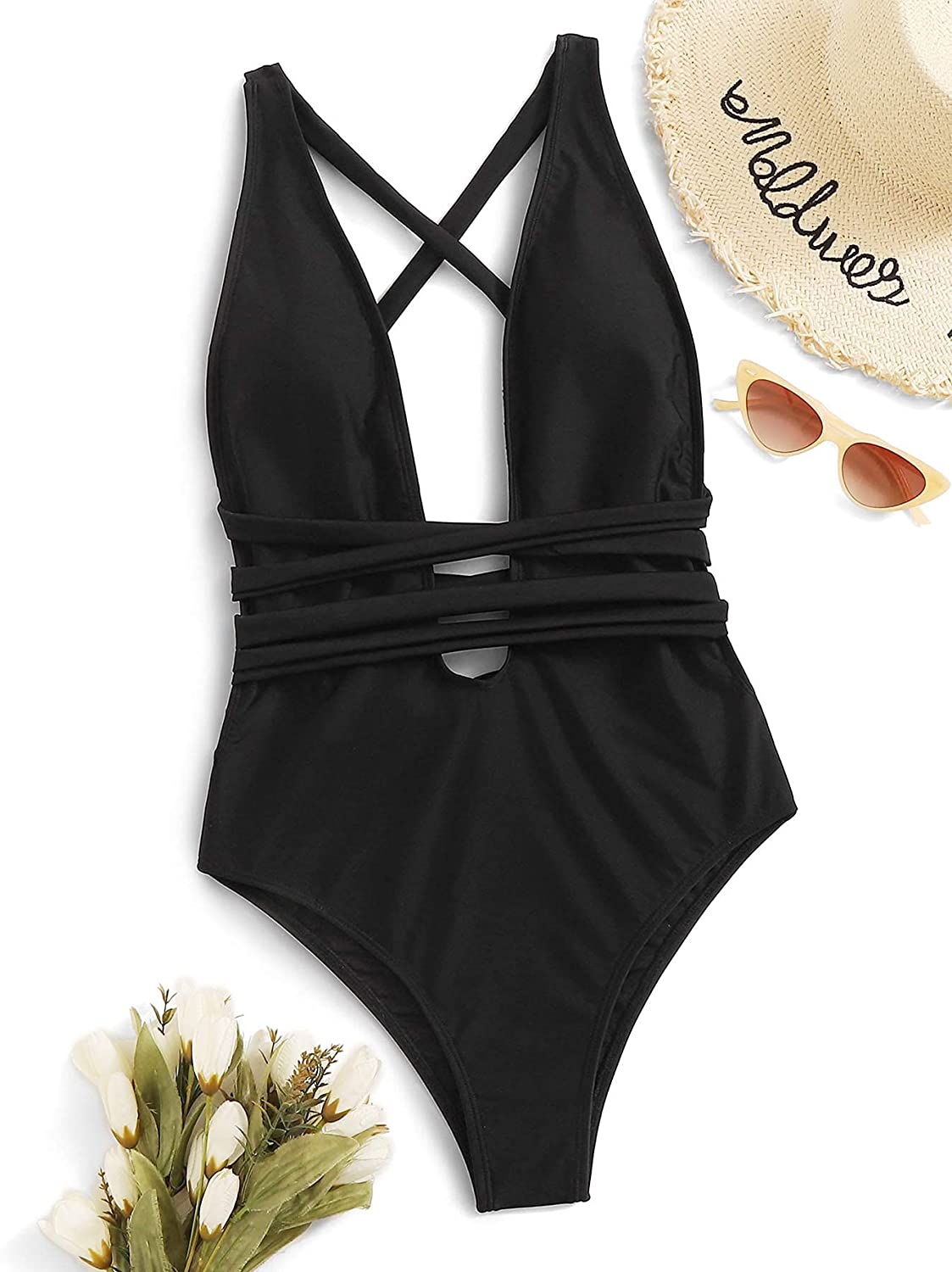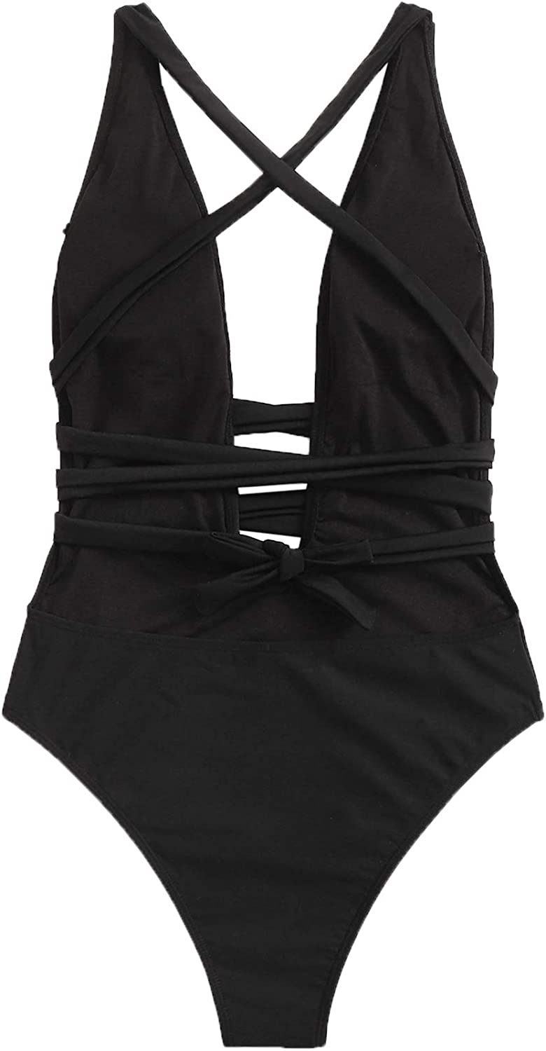 SweatyRocks Women's Sexy Basic Criss Cross Tie Knot Front Deep V Open Back One Piece Swimwear