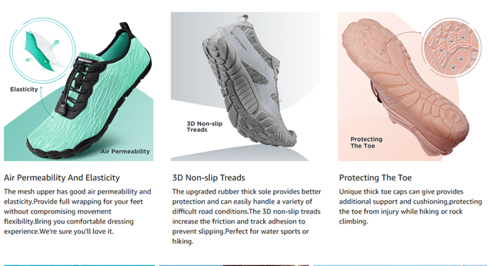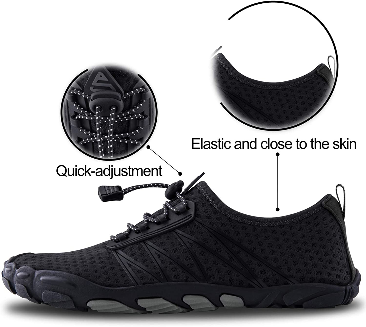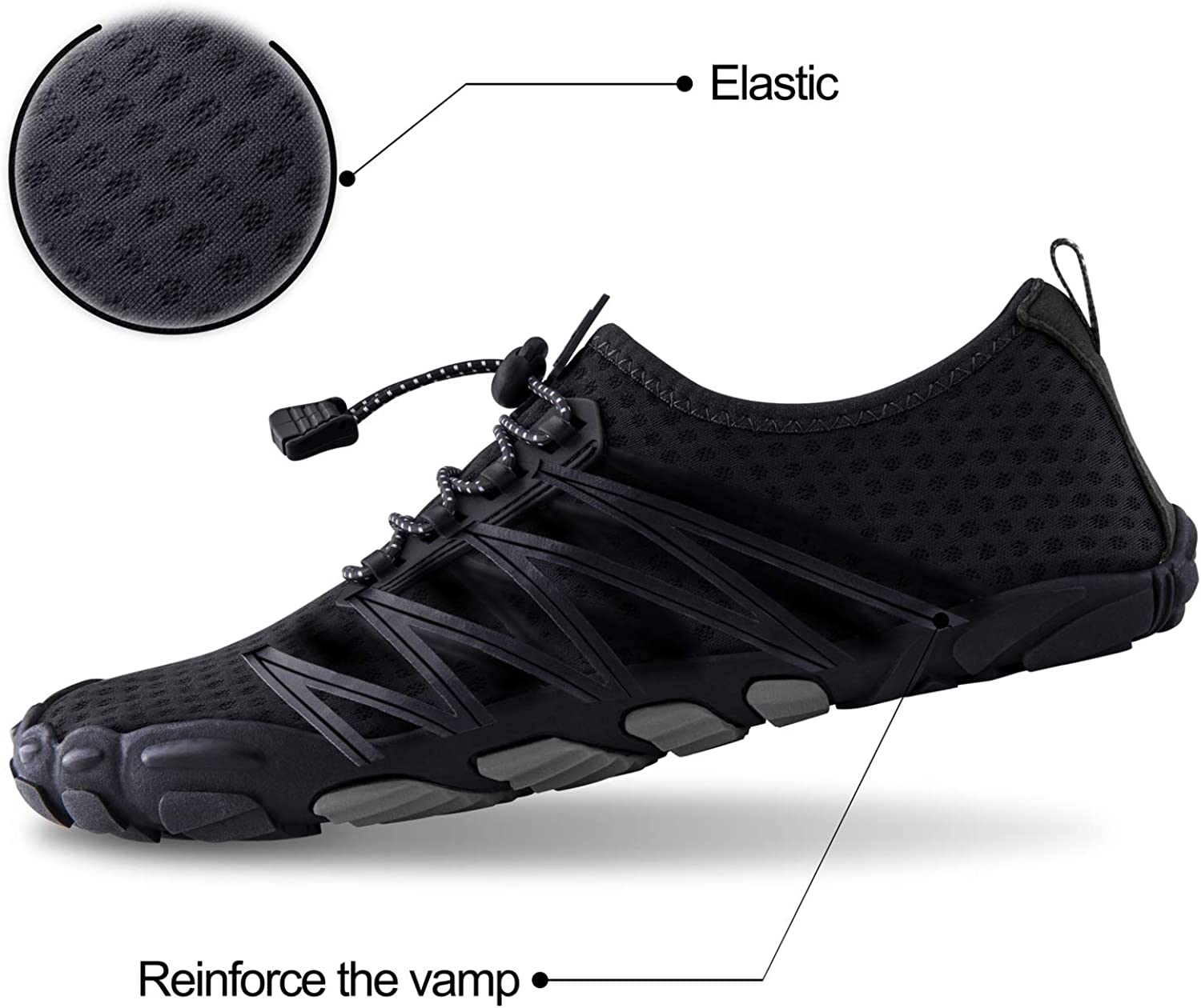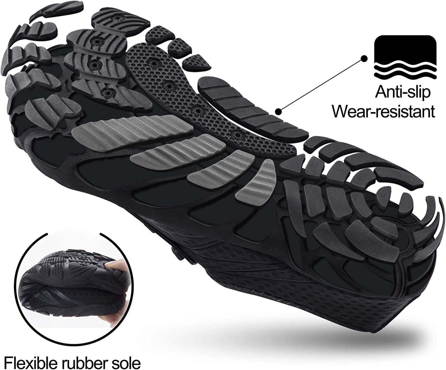 • All-round Protection:Thick rubber soles and a toe cap keep your feet completely protected from sharp objects and provide great cushioning. The 3D non-slip treads provide exceptional grip even in slippery conditions. This makes it a great choice for outdoor sports.