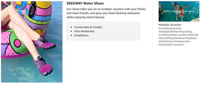 • Breathing shoes:The shoe was designed to be ultra-breathable: Spandex vamp has tiny air holes for quick drying and the outsoles、insoles are designed with drainage holes to drain the water.This forms a perfect breathing system that keeps your feet cool and dry, from the inside to the outside.