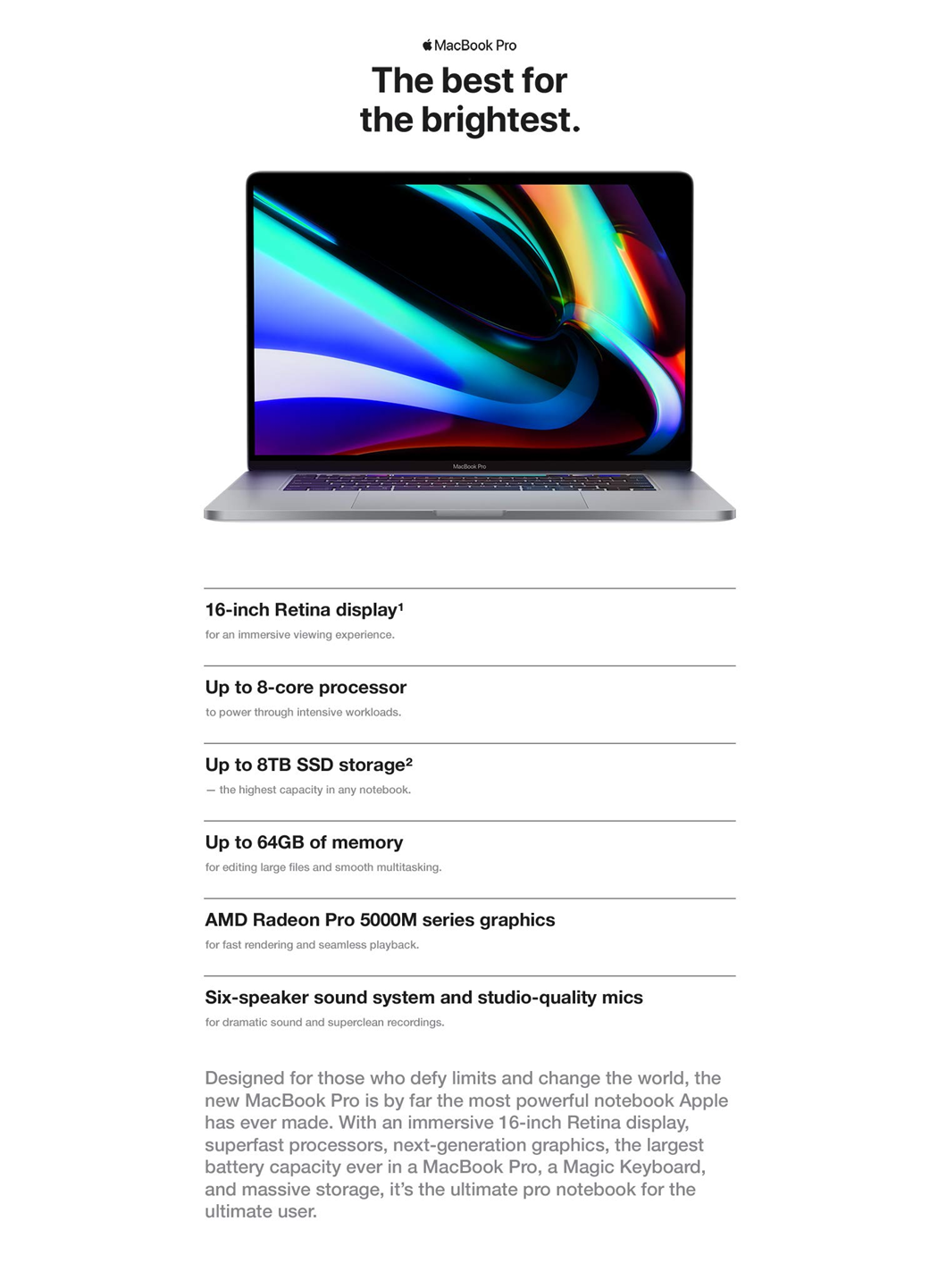 | Display | 16.0-inch (diagonal) LED-backlit display with IPS technology; 3072x1920 native resolution at 226 pixels per inch with support for millions of colors |
