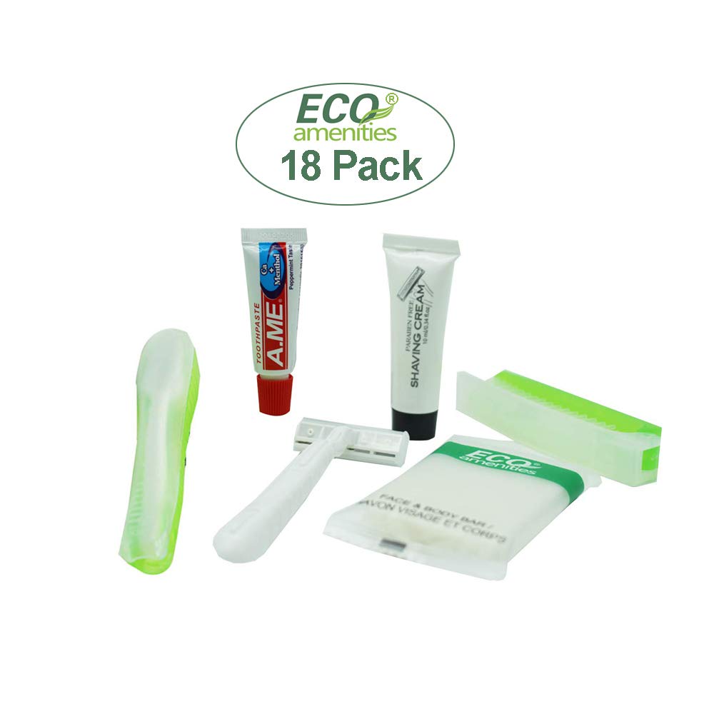 VALUE PACK AND TRAVEL SIZE: 6-Piece travel necessities in a pre-packaged convenient travel bag, and 18 Bags in one carton. Total of 108 pieces at a reasonable price. Package contains:1.0 oz mini shampoo, body wash, 1 oz travel size soap bar, shaving razor with cream, folding toothbrush with a built-in case and 0.6 ounce mini toothpaste, and foldable grooming comb. Travel size hotel bathroom toiletries to eliminate waste and easy to take to go.