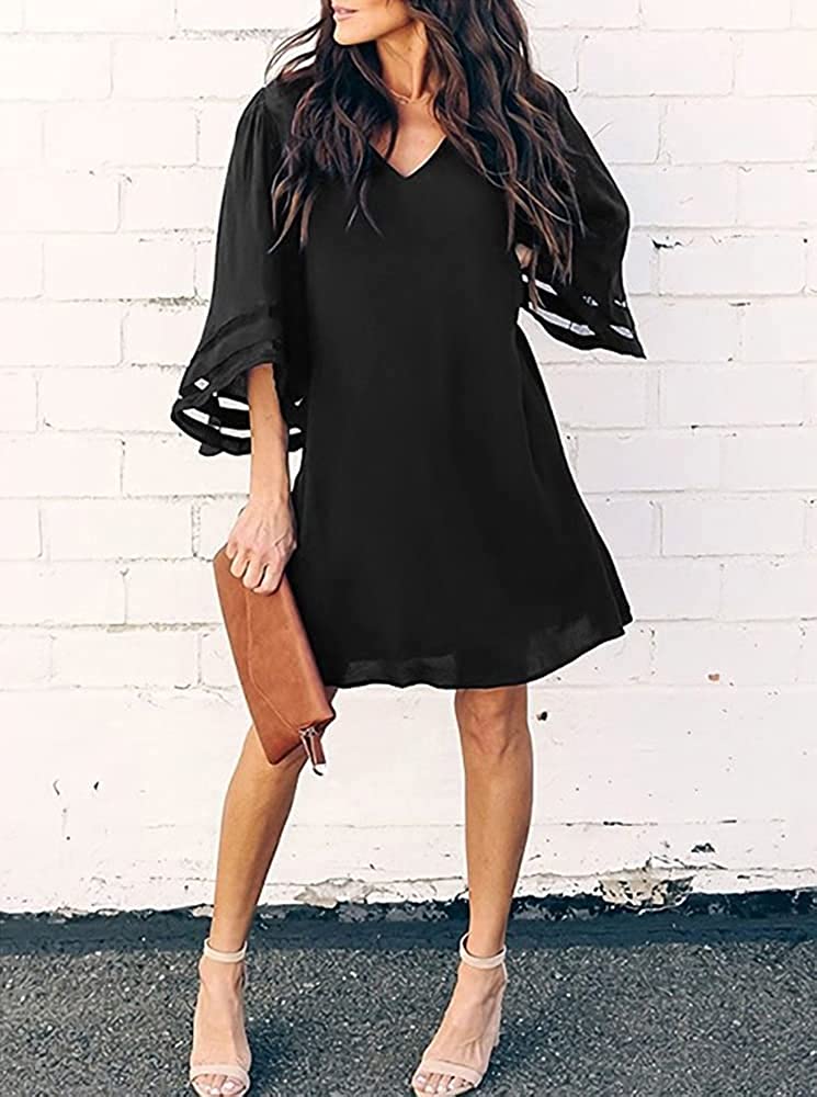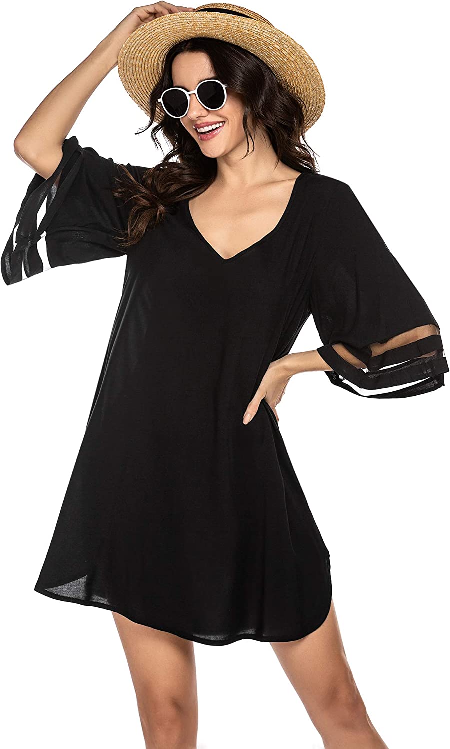 • 【Unique Design】Features the deep v-neck and 3/4 bell sleeve with mesh panel patchwork design, you can easily create a stylish and cute look with a sun hat and sunglasses. Loose-fitting, flowing cover up features bell sleeves with a flounce effect at the cuff for added flair. This knee-length dress will let you enjoy silky smoothness when you're walking.