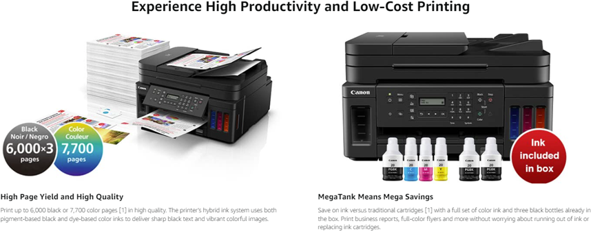 Meet the PIXMA GRNUM Wireless MegaTank all-in-one printer - designed for serious print productivity with a high page yield of up to 6 000 pages of Black text or up to 7 700 vivid color pages per full ink bottle set from the reliable refillable ink system. The PIXMA GRNUM MegaTank printer delivers outstanding high yields resulting in a low cost per page and also features superior versatility thanks to an ADF for scanning copying and faxing. The GRNUM allows you to keep working - even on large print jobs - with auto 2-sided document printing borderless2 photo printing and a 350 sheet plain paper capacity connectivity is paramount with the GRNUM featuring Wi-Fi 3 and Ethernet connection when printing from computers and also for mobile printing with airprint 4 Mopria Print Service5 and the Canon Print app6 for even more printer information and control.