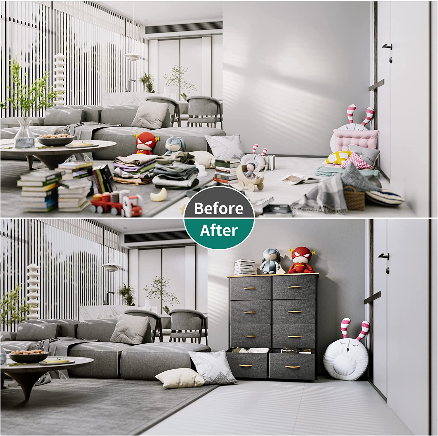 8- DRAWER DRESSER- The 8 deep drawers are foldable and removable, with easy-to-pull plastic handles rounding out the design; High quality non-woven synthetic fabric is easy to care