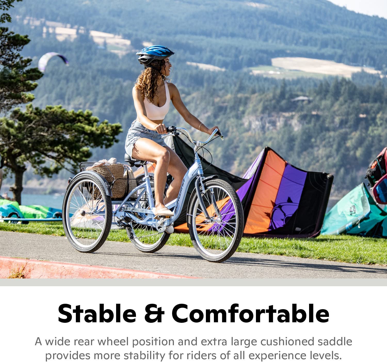 • Wide upright handlebars provide a stable, balanced ride, and the extra-large comfort cruiser saddle absorbs bumps