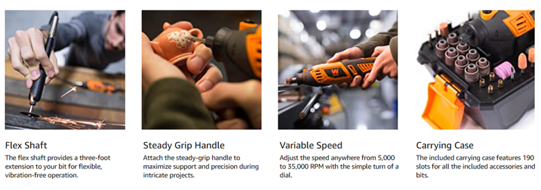 • Powerful 1.3A variable speed motor goes anywhere from 8,000 to 35,000 RPM