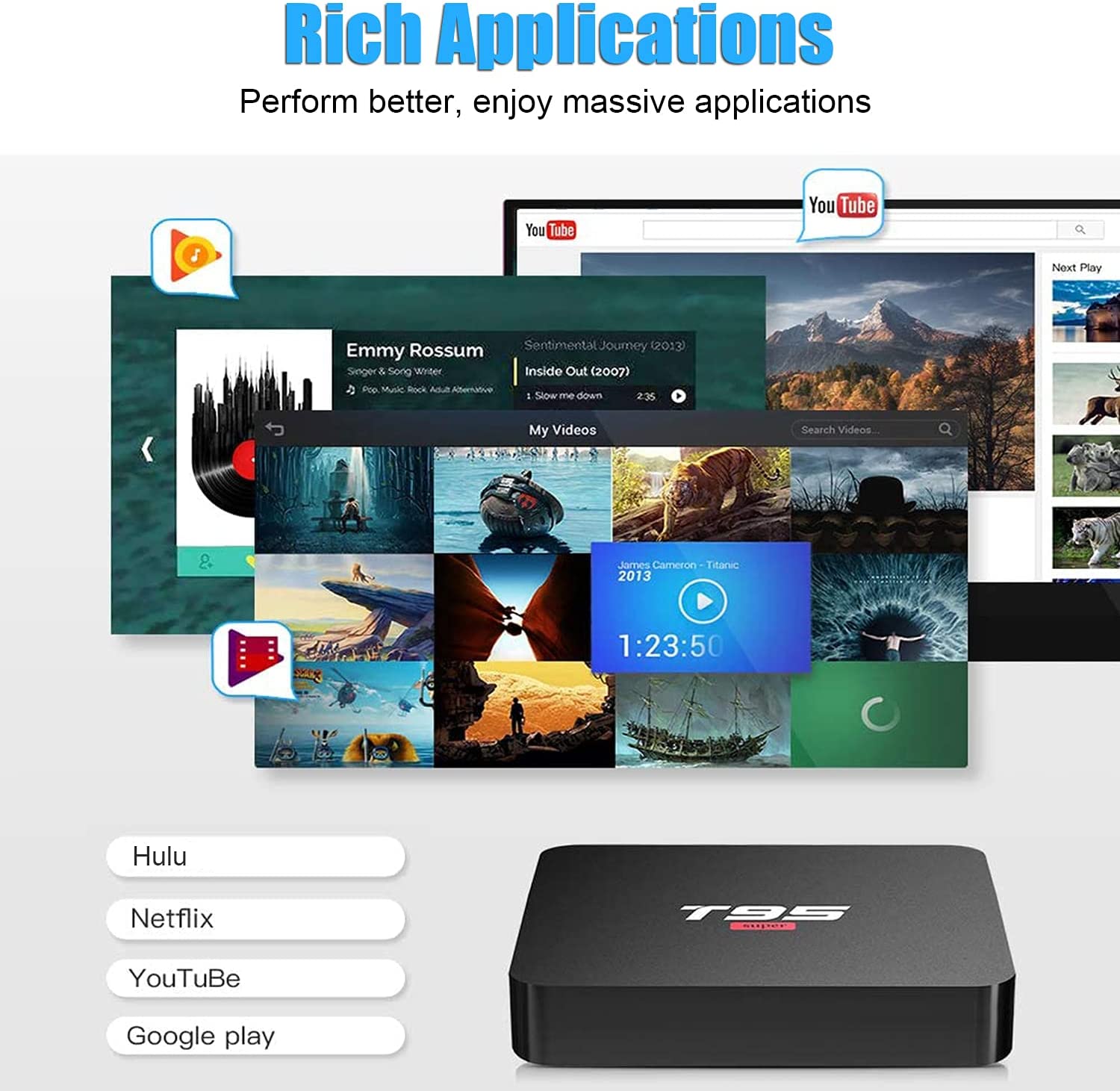 【TV Box 4K 3D H.265】The smart TV box based on H.265 decoding technology saves 50% of bandwidth resources than H.264. You can watch movies fluently with more realistic image details. It supports 4K resolution and 3D movie. You can freely enjoy 3D cinema-like visual feast at home.