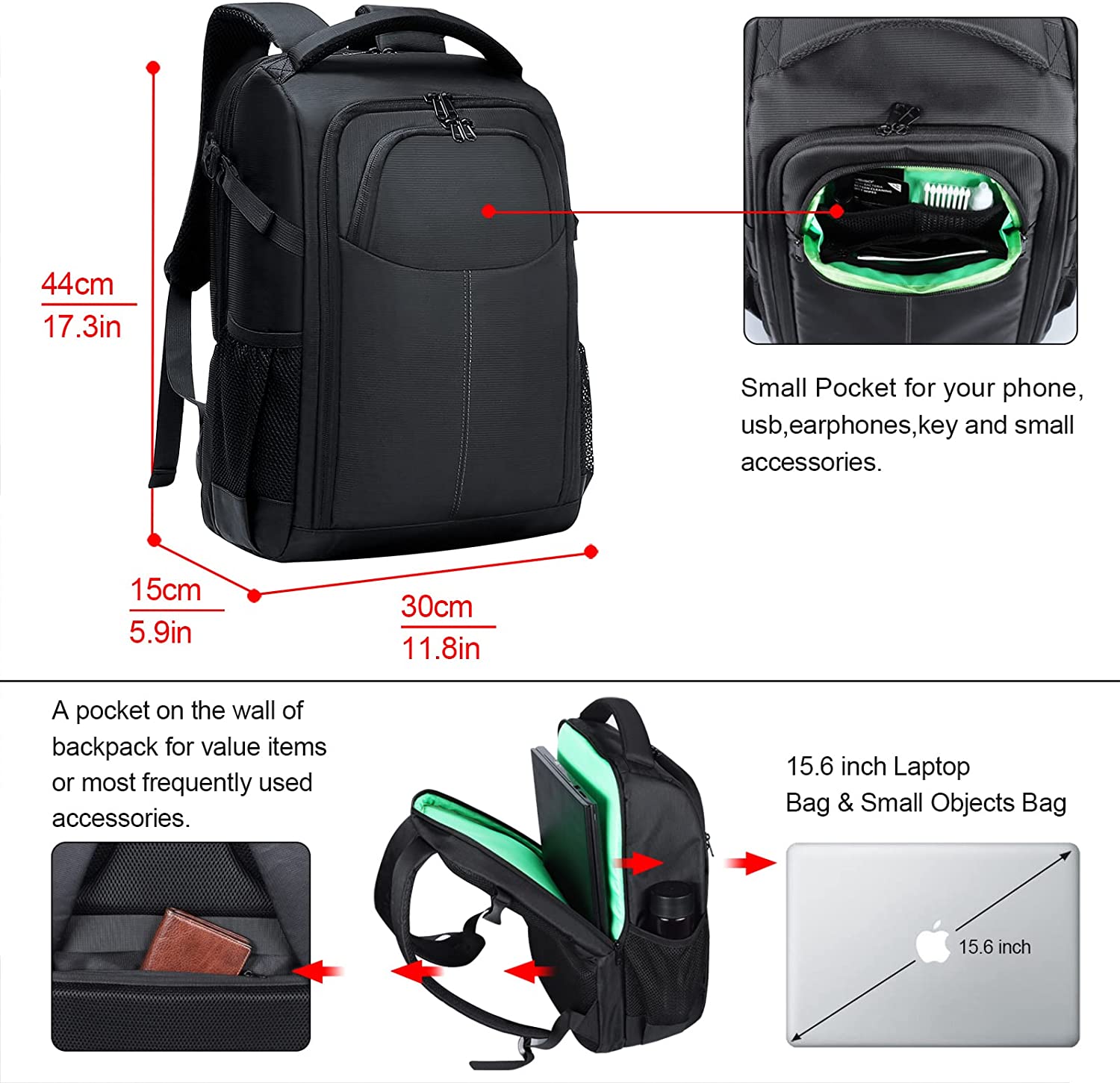 ?Professional Camera Backpack with 15.6 inch Laptop Compartment: There’s a separate, dedicated compartment for most slim 15.6 inch laptop. More pocket——①small upper zipper pocket for your phone,usb,earphones,key and small accessories. ②One zipper pocket on the wall of backpack for value items or most frequently used accessories.