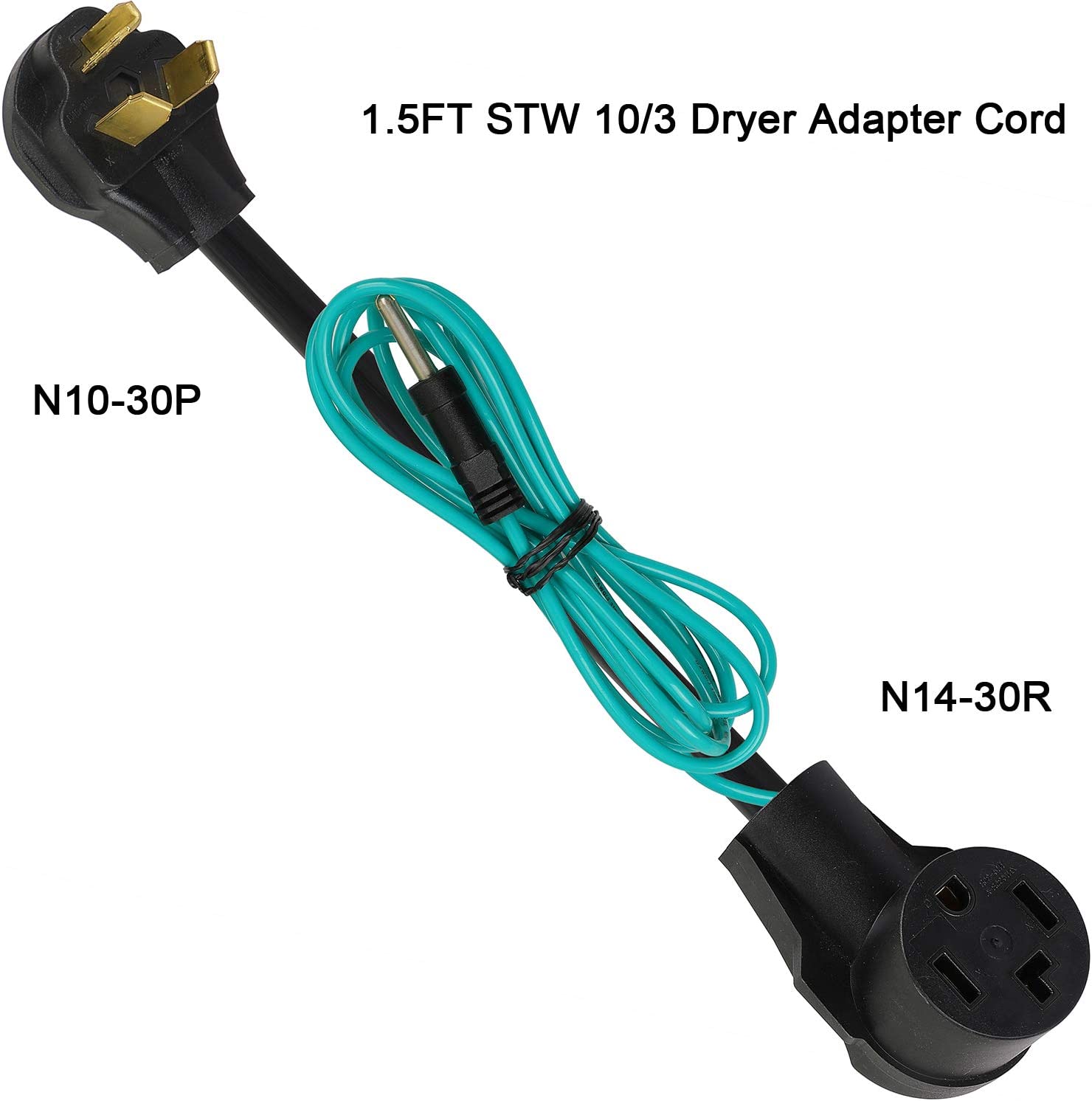 Dryer Plug Adapter 4 Prong to 3 Prong, Dryer Prong Adapter 4 to 3 Cord N10-30P to N14-30R, 1.5FT STW 10AWG/3 3 Prong Dryer Washer Cord, 30AMP, 250 Volt