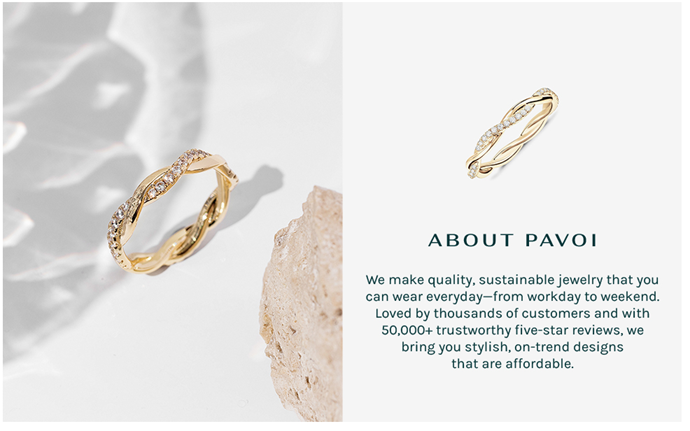 • ✦ SUSTAINABILITY ✦ PAVOI is dedicated to sustainability throughout our entire product cycle. Our jewelry is made from 100% recycled materials and we package in 99% recycled and compostable materials. We work to reduce our carbon emissions and offset plastic consumption by removing 275,000 bottles from oceans annually. We are committed to maintain a balanced and eco-friendly business that minimizes our environmental impact. Trust that PAVOI is continuously working towards a greener future.