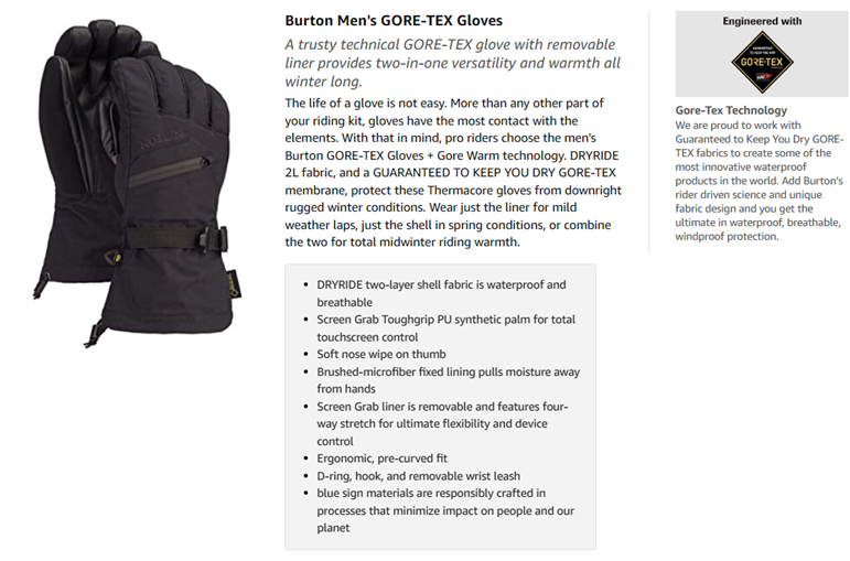 The life of a glove is not easy. More than any other part of your riding kit, gloves have the most contact with the elements. With that in mind, pros choose the bestselling Burton GORE-TEX Glove + Gore warm technology. DRYRIDE 2L fabric, and a GUARANTEED TO KEEP YOU DRY GORE-TEX membrane protect this Thermacore insulated glove from downright rugged winter conditions. Screen Grab synthetic leather gives you stealth touchscreen control with any finger. A removable four-way stretch fleece liner dries quickly and gives you options for any weather. Wear just the liner when shoveling, just the shell in sloppy spring conditions, or combine the two for total midwinter warmth and comfort.