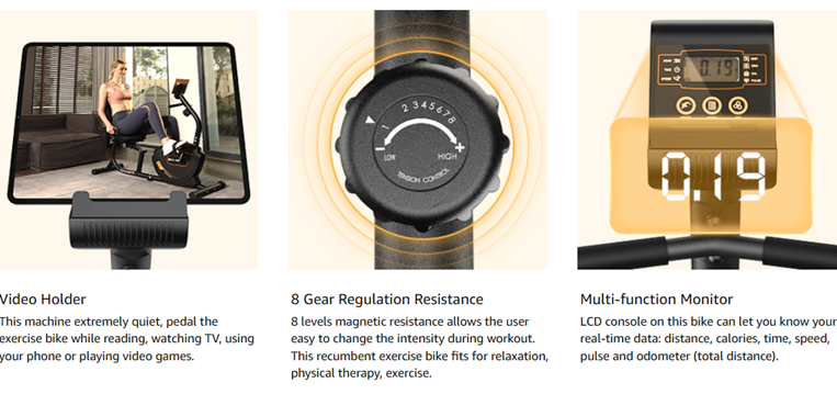 • 【Smooth & Quiet Recumbent Bicycle】Stationary recumbent bike use 8 neodymium magnets,each of which has excellent magnetic properties. The resistance is more uniform and the service life is longer. In addition, the craftsmanship of the dual belt system makes for a smoother and quieter experience.