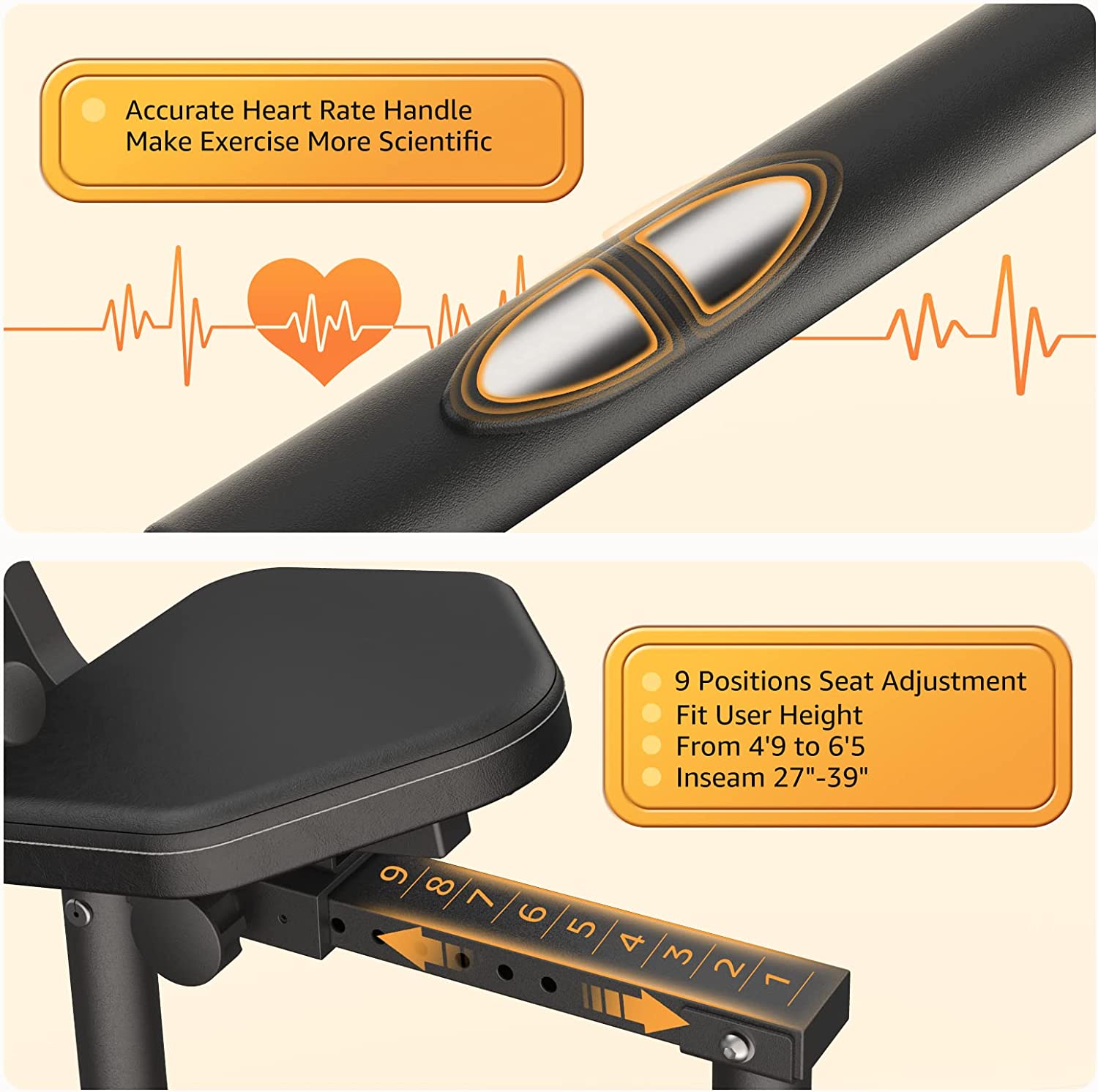 • 【Adjustable Exercise Bike】The stationary bike has 53.5-inch frame and 9 position-adjusted seats for adults and seniors who are 4 '9 "to 6' 5", inseam length 27 "to 39" inseam, and loads up to 300 lbs.