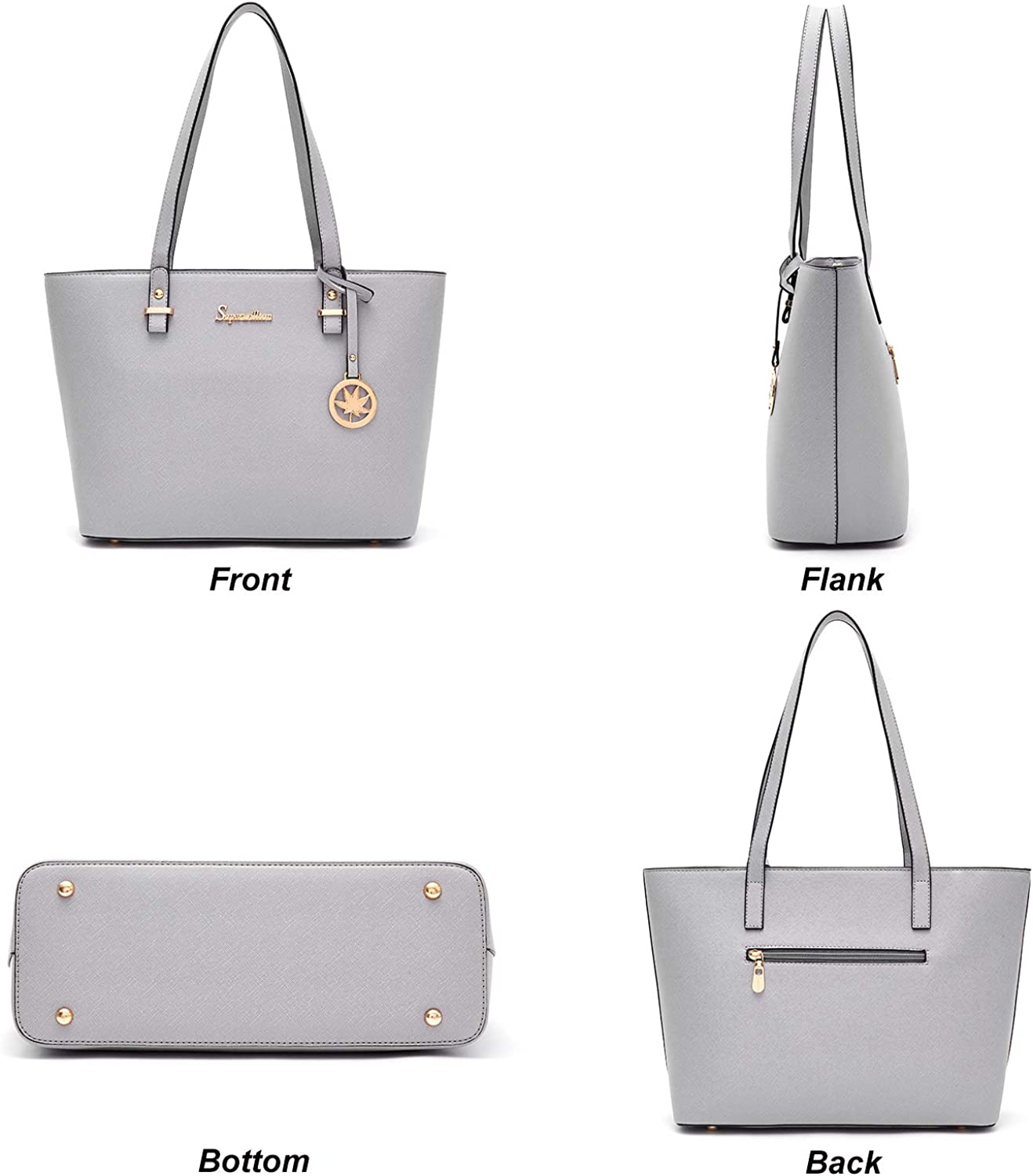 【Pockets】 Tote bag: One main compartment with one interior zipper pocket and two slot pockets. 5pcs purse set include large tote handbag, messenger bag, wallet, clutch and card holder. The purse set can hold your iPad, wallet, makeups, phone, little water bottle, perfumes, gloves and other daily use and keep them organized.