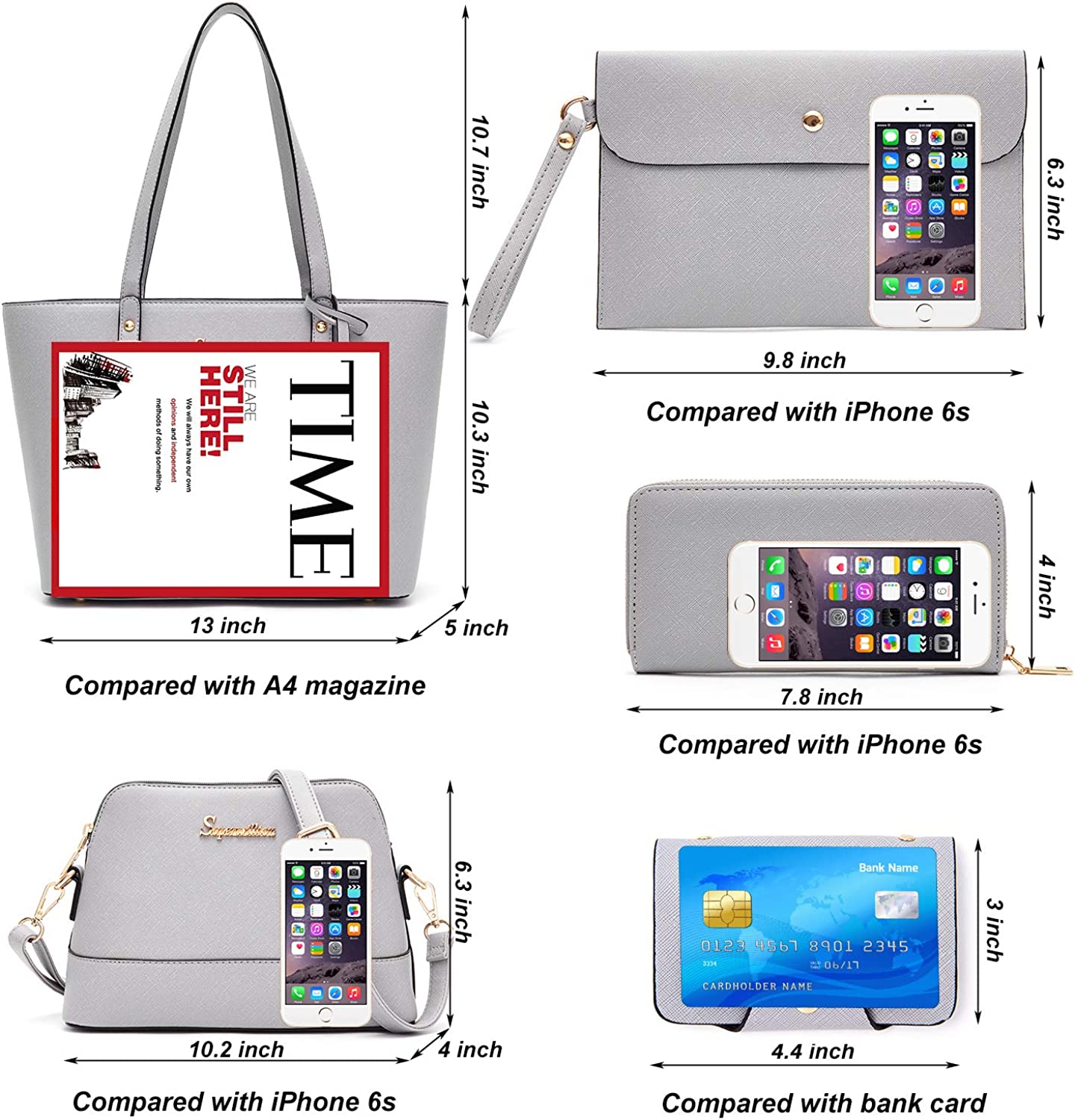 【Dimension】 Tote Handbag: 13" x 10.3" x 5"(W*H*D), Strap Height:10.7" Messenger bag: 10.2" x 7" x 4"(W*H*D) Wallet: 7.8" x 4"(W*H) Clutch: 9.8" x 6.3"(W*H) Card Holder: 4.4" x 3"(W*H). You can use them together or individually, suitable for daily use.