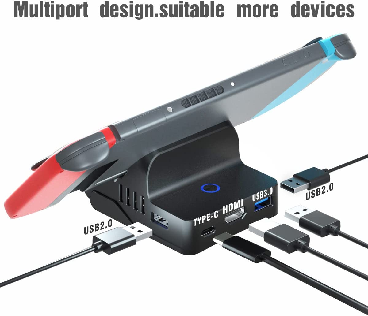 • Multiport Switch Docking Station:Switch docking station with USB2.0 X2,USB3.0 X1,HDMI X1,Tpce-c X1 port.Switch LAN adapter plugs into ultra-high transfer speed USB3.0 port. Increase your advantage in the game.Switch docking station compatible gamecube adapter support multiplayer online games. Playing Super Smash Bros with friends or family during game time.