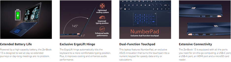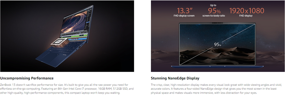 Creativity. Style. Innovation. These are the qualities that define the elegant new ZenBook 13. Everything in this take-anywhere masterpiece is designed to give you the freedom to discover your creative power, including its breathtaking frameless NanoEdge display. You’ll appreciate not only the tremendous power within, but also the thoughtful attention to detail — an exclusive ErgoLift hinge and NumberPad touchpad. Designed to give you the most screen area in the least physical space, the new frameless four-sided NanoEdge design of ZenBook 13 is simply breathtaking: it makes any visuals more immersive, with less distraction for your eyes. The ultraslim bezels are just 2. 8mm thin at the sides, 3. 3mm at the bottom and a mere 5. 9mm at the top to accommodate the camera. And with this ultra-compact display, ZenBook 13 is only about the size of an A4 sheet of paper, weighing in at 2. 6 lbs, making it the perfect business laptop to carry around. With any ZenBook, your comfort is one of our top priorities. ZenBook 13 goes the extra mile with its exclusive ErgoLift hinge, an engineering masterpiece designed to automatically tilt the keyboard to the most comfortable typing position. But that’s not all: the carefully calculated tilt improves cooling and audio performance, too. All of these carefully thought out design choices make this the perfect professional laptop and a great PC alternative to a MacBook!