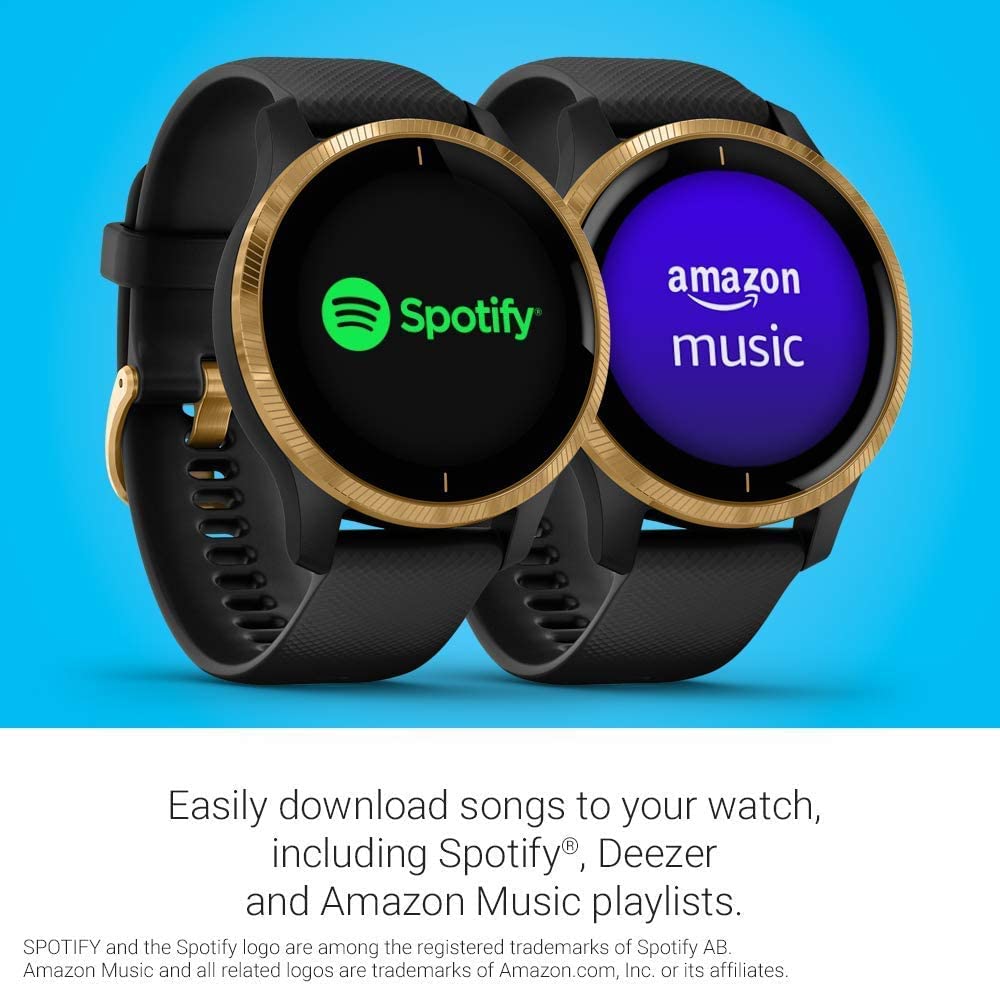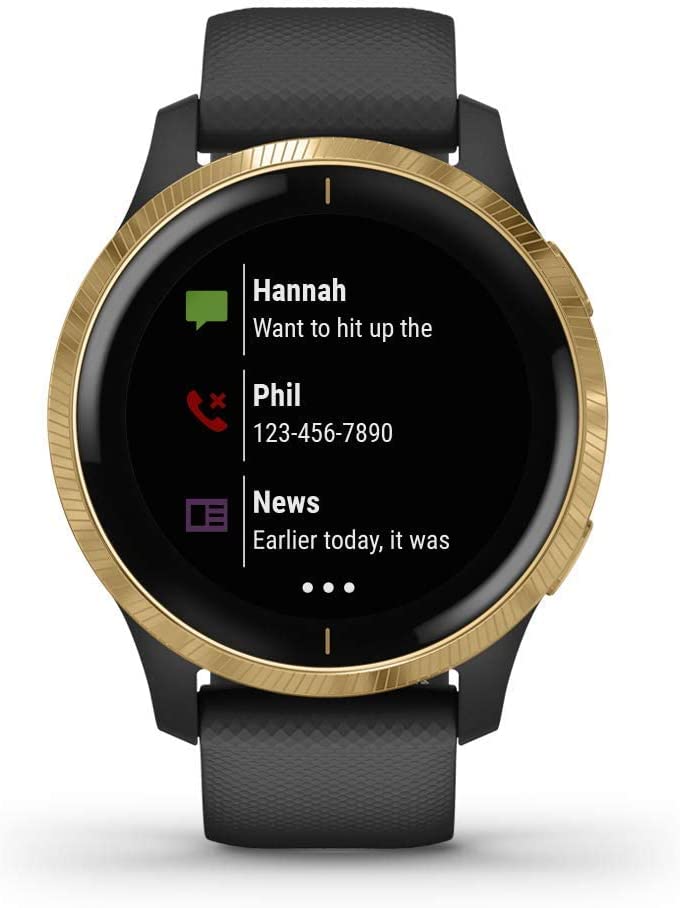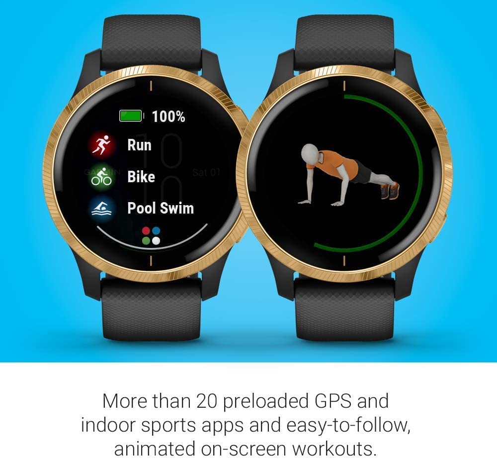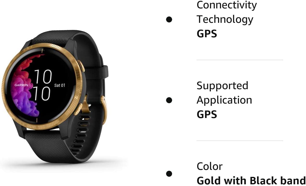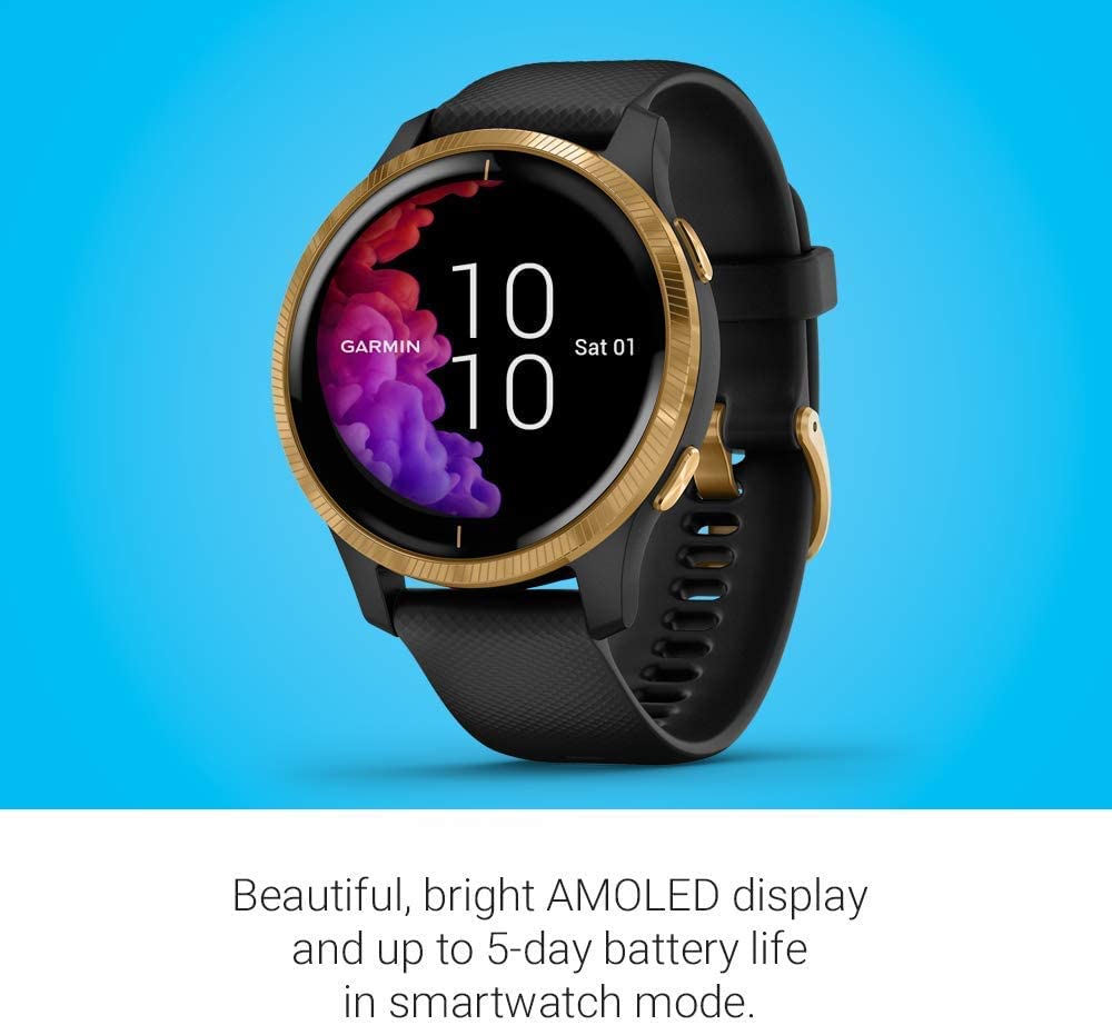 Garmin Venu, GPS Smartwatch with Bright Touchscreen Display, Features Music, Body Energy Monitoring, Animated Workouts, Pulse Ox Sensor and More, Gold with Black Band (Renewed)