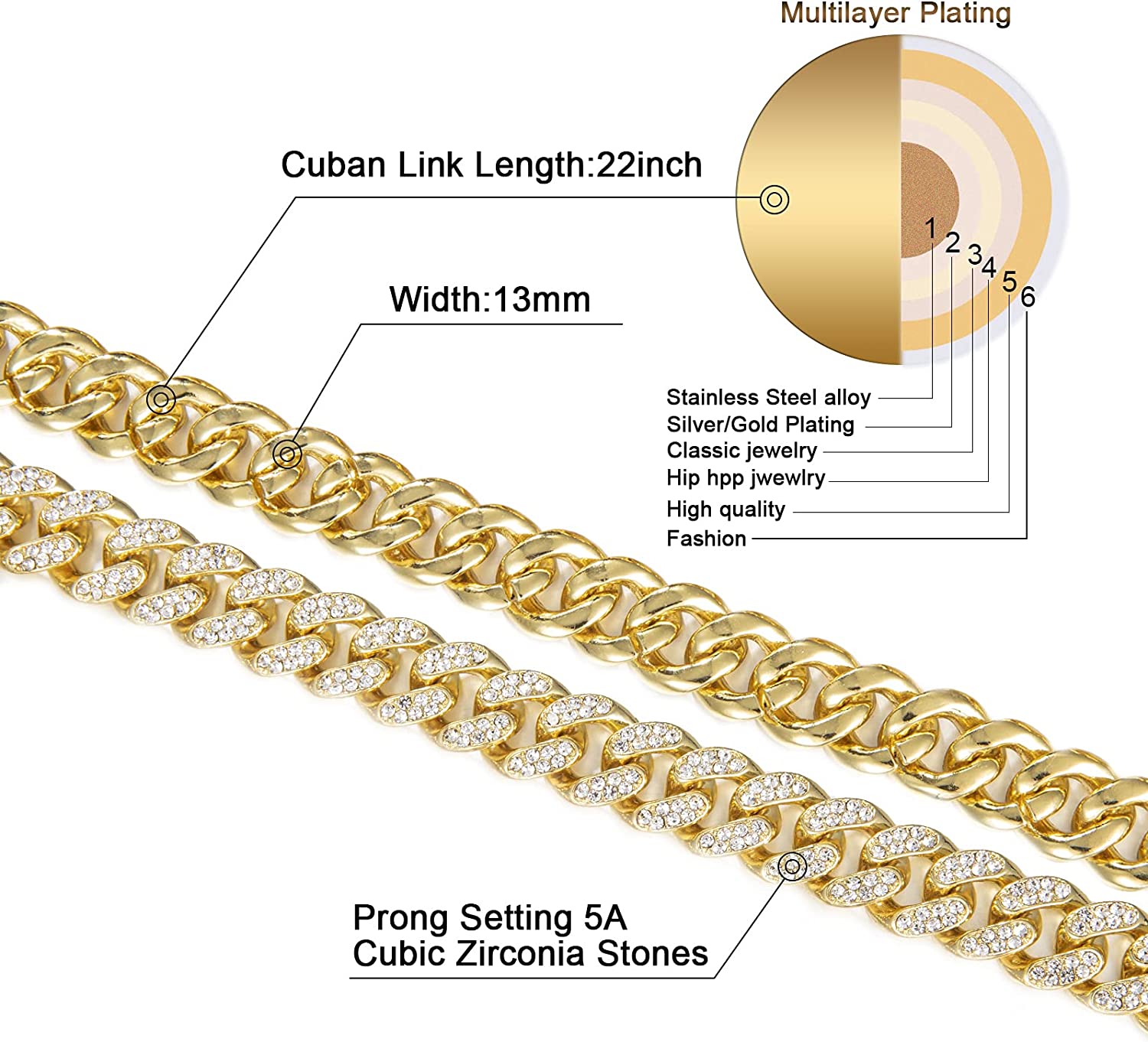 • Material:High quality gold silver plated chain necklace with over 300 rhinestones,Hand-made process to ensure product can be precious and shine more,all the rhinestones are hand inlaid by craftsmen,cuban link necklace it's nickel-free, lead-free and harmless to health