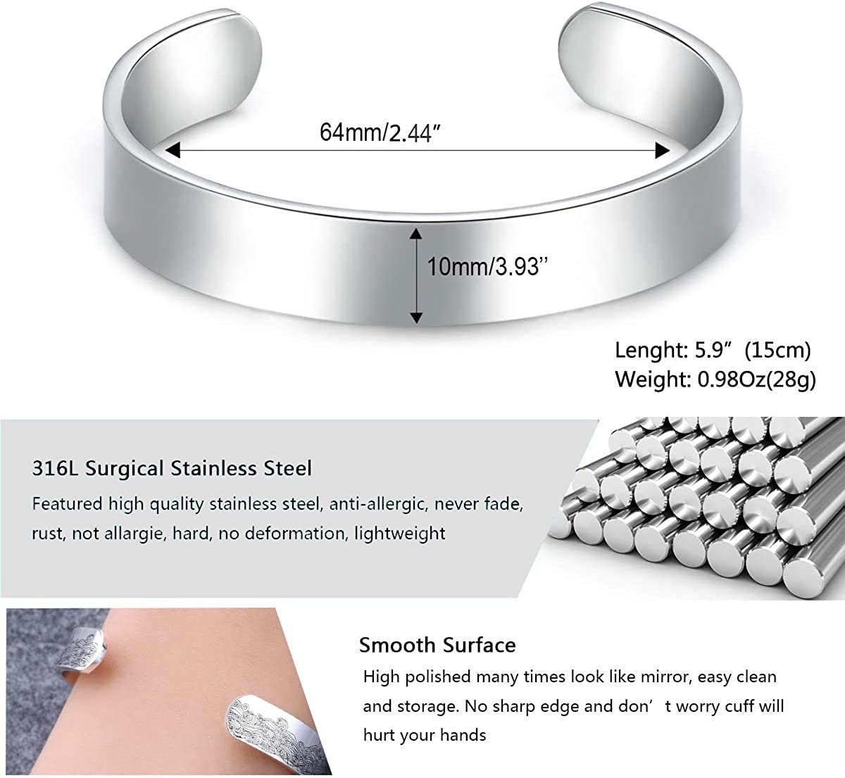 • Affordable Price with exquisite quality, High polished cuff bracelet, shinne surface, very smooth with rounded edges to avoid scratch your wrist, clear engraved easily reading