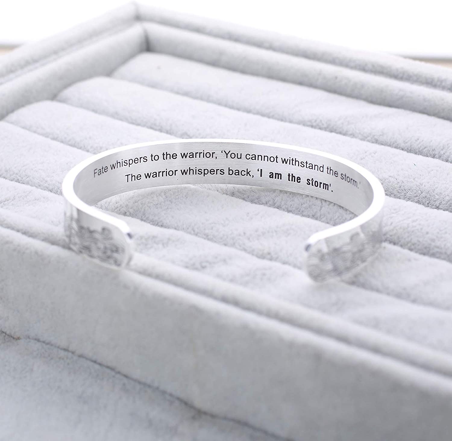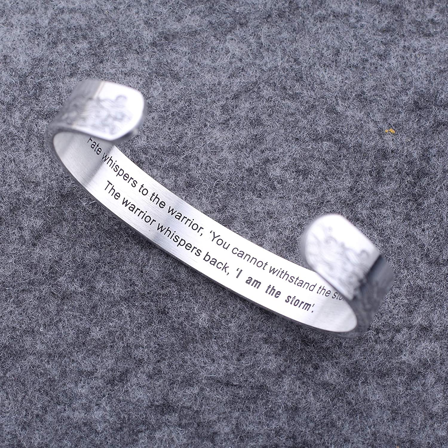 • 3/8" hidden message cuff bracelet.Fate whispers to the warrior, ‘You cannot withstand the storm.’ The warrior whispers back, ‘I am the storm'