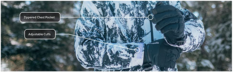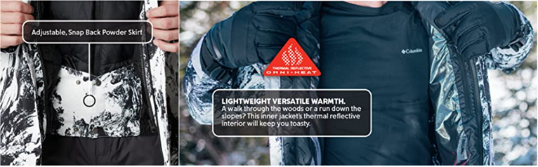 • OMNI-HEAT: Our patented Heat Reflective garments are the ultimate body heat management system for outdoor performance. The interior lining consists of our metallic dot pattern designed to retain heat, while the breathable fabric dissipates moisture.