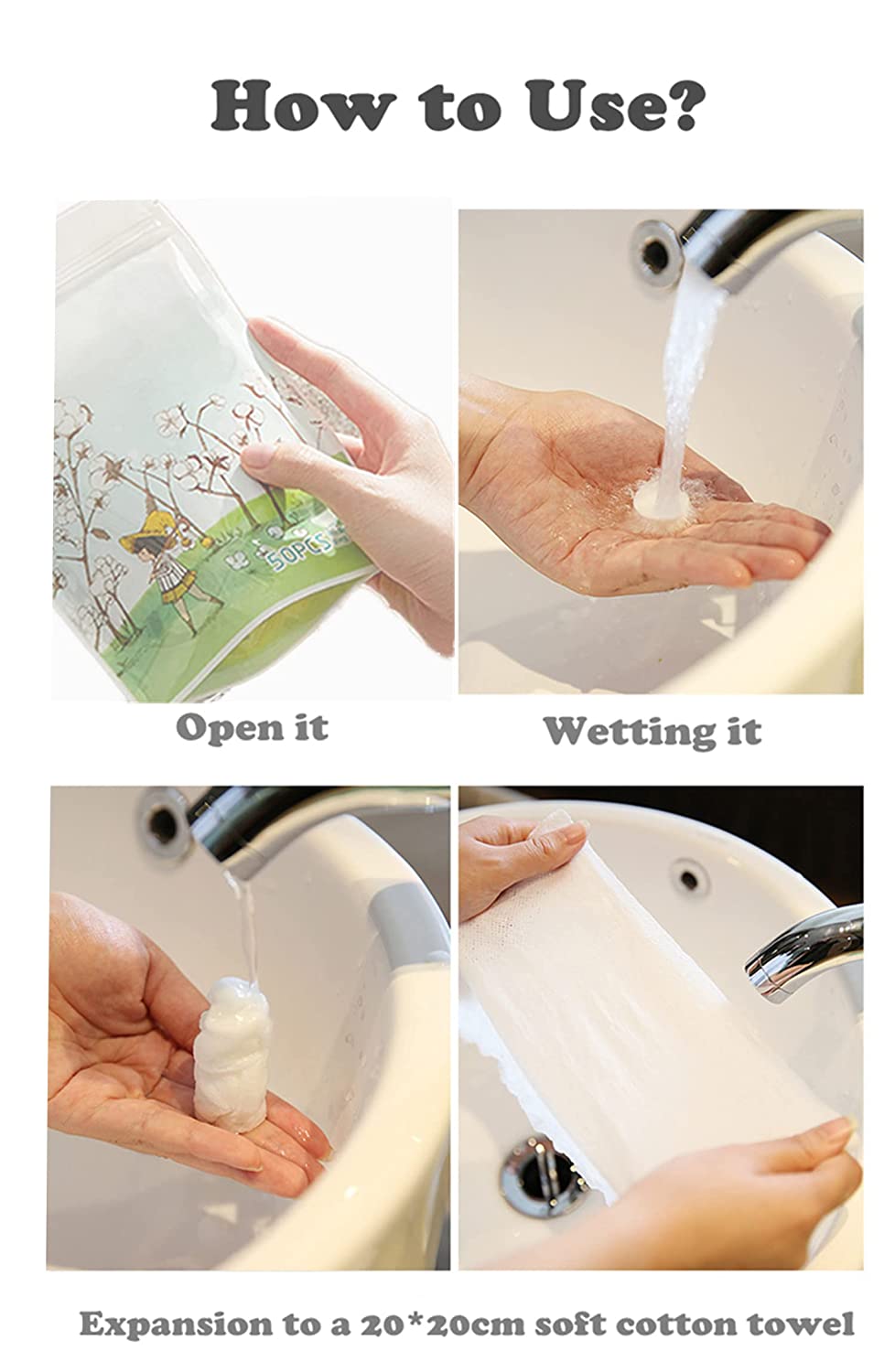 • Easy to Use: Just open the package and wetting it, it will absorb the water and expansion to a 7.8 x 7.8 inch size small towel after three seconds.