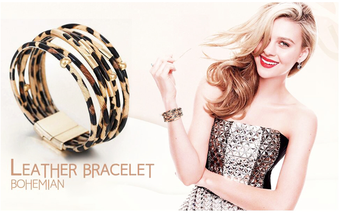 Fesciory Leopard Bracelet for Women, Boho Leather Wrap Multi-Layer Pearl Crystal Bracelet Bangle Jewelry