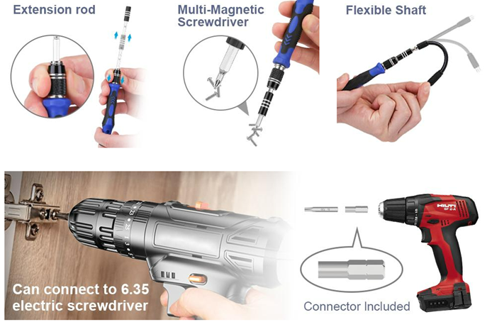 • 【Humanized Design】Ergonomic and press & push design handle, it is comfortable to hold even for the long-time use. Flexible Shaft Extension Rod and Solid Shaft Extension Rod with STRONG magnetic tips makes it easy to fix bit and pull screws out, a flexible shaft included is perfect for electronics where the shaft is hard to get, ideal for stereo work.