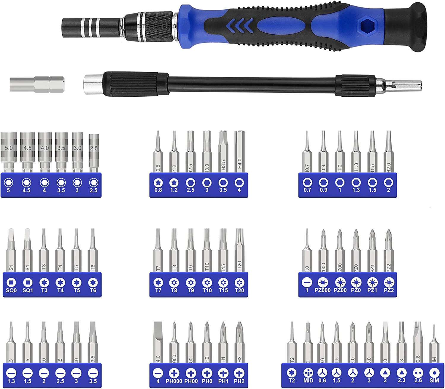 Included Components‎screwdriver bits (Phillips, Flathead, Torx, Torx Security, Pentalobe screwdriver and more), Screwdriver Handle, Flexible Shaft Extension Rod, Solid Shaft Extension Rod, 1/4-4mm Driver Adapter