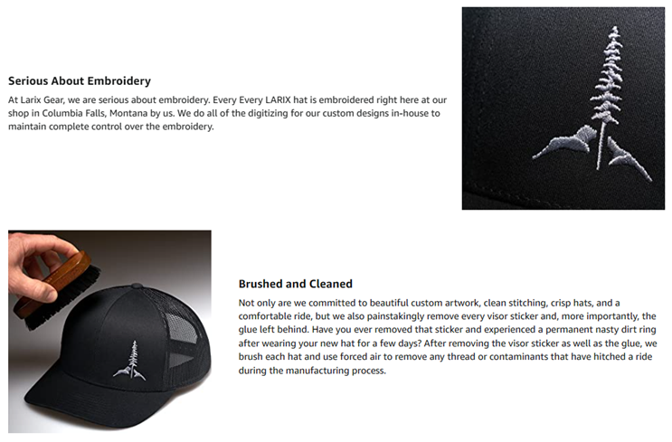 - SERIOUS ABOUT EMBROIDERY : Every Larix hat is embroidered right here at our shop in Columbia Falls Montana by us. It's our highest priority to achieve outstanding results by using the most advanced sewing technology and techniques available today.