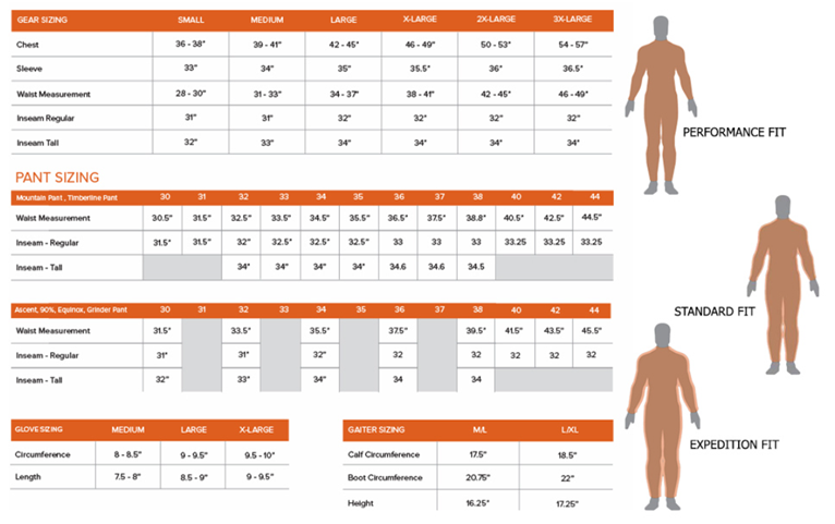 E/F - EXPEDITION FIT - Designed for maximum layering in the worst conditions. Cut roomier to accommodate additional layering underneath.