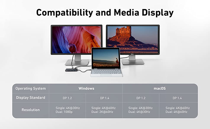 2) Dual monitor: 4K@30Hz if your device supports DP 1.4; 1080p@60Hz if your device supports DP 1.2