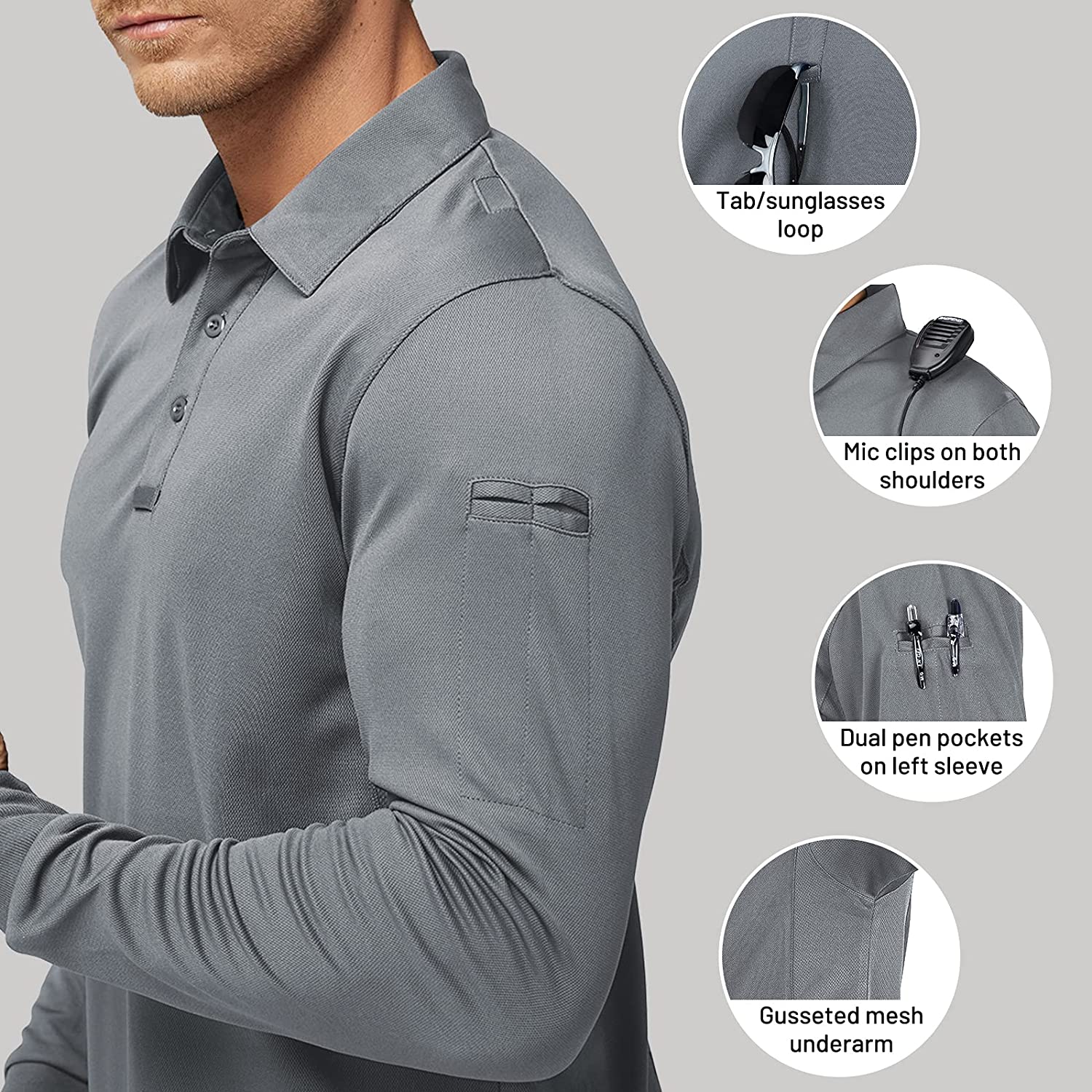 • No-roll collar gives this polo shirt a professional look with all the tactical functionality to get the job done. 3-button placket front with mic tab/sunglasses loop. Mic clips on both shoulders