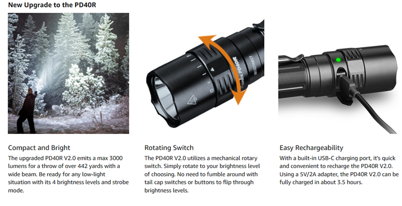 • HIGH CAPACITY POWER AND RECHARGEABLE - The PD40R v2 has a fast charging USB-C port to fully charge the flashlight within 3.5 hours, ready to go the extra mile whenever you need it.