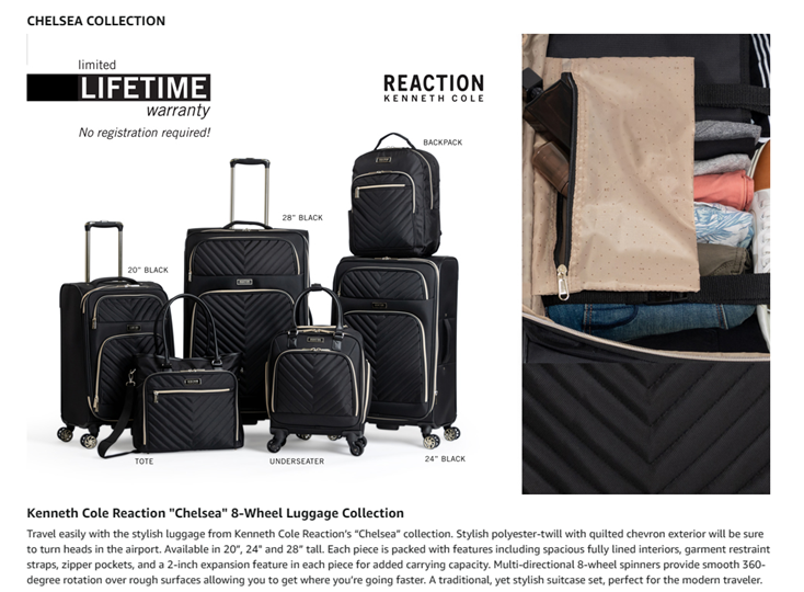 Finally, travel made trendy with the stylish polyester-twill chevron luggage from Kenneth Cole Reaction’s Chelsea luggage collection. Complete with a fully lined, tear-resistant interior, this luggage also expands an additional 2.0 inches, ensuring that you have plenty of space for all your needed belongings. Its lightweight construction helps you meet airline weight restrictions to avoid unnecessary airport fees, while its 8-wheel spinners provide effortless 360-degree navigation allowing you to glide quickly through the airport. The main compartment interior features a hanging side zipper pocket and garment restraints to hold belongings in place. The under-the-lid section includes a mesh zipper pocket and a transparent, clear PEVA gusseted pocket for toiletries. The front exterior also features a small zipper pocket for easily accessible items and a large gusseted zipper pocket for additional storage organization. Padded top and side handles allow for easy maneuvering, and a bottom grab handle allows for easier lifting. Additionally, a retractable trolley handle extends to be 41 inches tall with a locking push button mechanism. Fashionable and functional, Chelsea luggage also boasts fashion-forward gold hardware with premium self-repairing coil zippers designed for long-lasting use. Carry-on size meets most U.S. based airline carry-on size requirements and fits into most airline overhead bin compartments. Backed by a manufacturer 10-year limited warranty. ★ Overall Dimensions: 22.0” H” x 14.0” L x 9.0”-11.0” D. ★ Packing Dimensions: 20.0” H x 13.5” L x 8.5”-10.5” D. ★ Weight: 6.35 lbs. ★