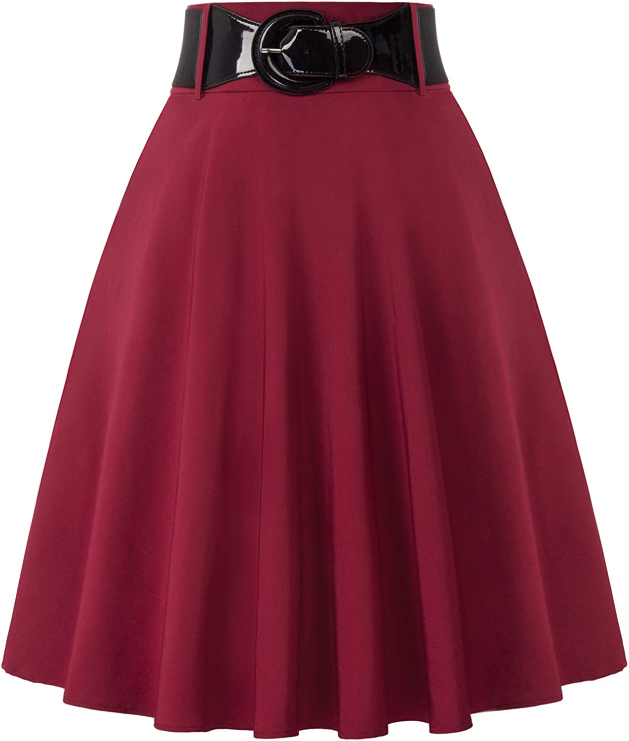 • Skirt Feature: High waist skirts with removable lether belt; Open side-seam pockets; Fixed belt adorns waist; Flared A-Line silhouette; Concealed zipper in the back