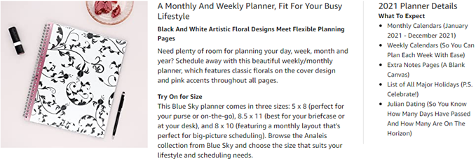Get ahead with elegant florals and refined design! This stylish CYO (create your own) cover planner will keep you organized everywhere you go. Add in your favorite photos, sentiments, notes or memories to the clear cover pocket, and keep organized with dated weekly and monthly pages inside for easy scheduling. Fresh page designs add a touch of style and offer plenty of room for all of your important information. High quality white paper provides clean writing space for jotting down your appointments, to-dos and reminders. Durable coated tabbed dividers are long lasting and make accessing information a breeze. Use this dated planner to stay on track for appointments, and to jot down notes and ideas in one place. Premium quality covers and twin-wire binding. Mix and match with other Analeis Collection planning products from Blue Sky to organize your daily life. Blue Sky creates modern and sophisticated organizational planners and calendars to fit the scheduling needs of busy people - whether business professionals, college students, teachers, or anyone with appointments to make note of. Keep your life organized with our full line of products including desk pad calendars, wirebound tabbed weekly and monthly planners with contacts and notes pages to accommodate your scheduling needs, and laminated two-sided wall calendars, all in a variety of colors and patterns to suit your lifestyle and personality.