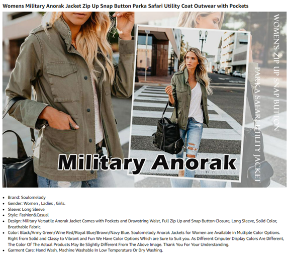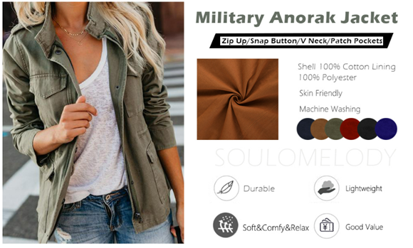 • Features: Military Anorak Jacket Comes with Pockets and Adjustable Drawstring Waist, Full Zip Up and Snap Button Closure, High Neckline, Full Sleeves with Velcro, Four Front Patch Pockets.
