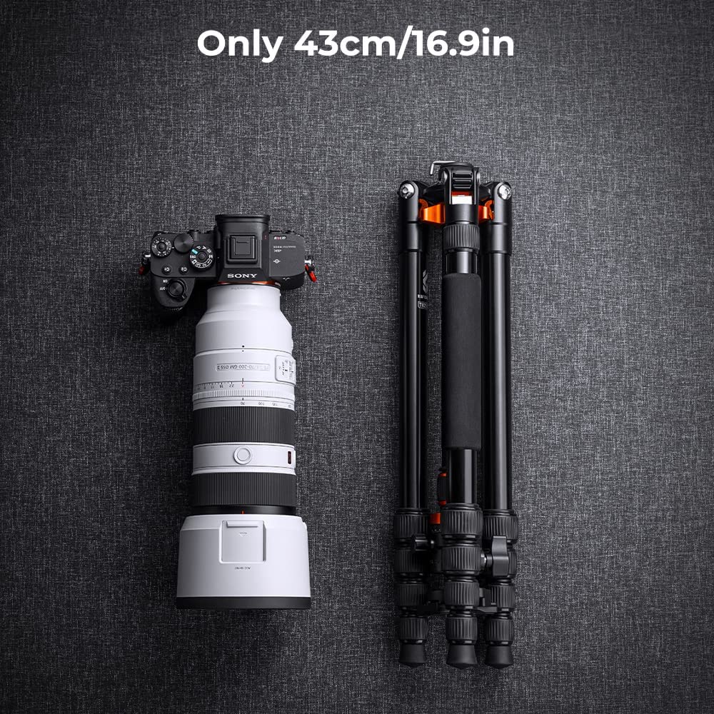 【Compact & Portable】 Quality military magnesium aluminum alloy,corrosion resistance; tripod with ball head weighs only 3.30 lbs/1.5kg, it can be 180°reflexed and folded to 16.9'', easy to put it in a backpack or suitcase when travel.