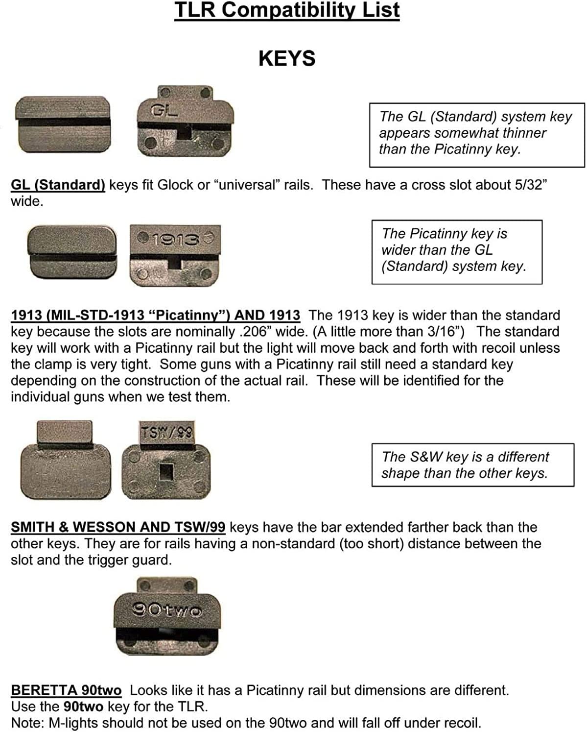 WALTHER: 99 - New (2004 models) FULL SIZE ones are nearly the same as the S&W 99 and use the S&W key. Older ones (no slot across the rail and the side grooves CLOSED in front) cannot be fitted with a TLR. 99 Compact – Cannot fit. Rail is too short. P22 – Cannot fit. Non-standard rail.