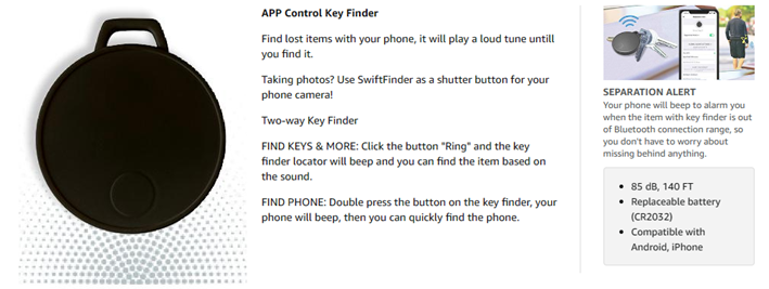 - FIND NEARBY - Wake up and ring your bluetooth key finder by using the SwiftFinder App when the distance is within 140ft. (Distance may be shortened due to the obstacle.) Or find it through Smart Home Devices, such as Amazon Alexa, Siri, Google Assistant.