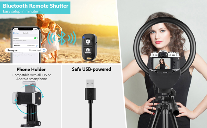 • 【High Brightness & Clever Touch Control】Sensyne selfie ring light features a high sensitivity touch panel design that has a longer life than traditional mechanical buttons. It provides full control to easily adjust the 3 color modes (cool white, warm yellow and daylight) and 10 brightness levels to meet your different needs. Perfect for Photographers, YouTubers, Vloggers, TikTokers, etc.