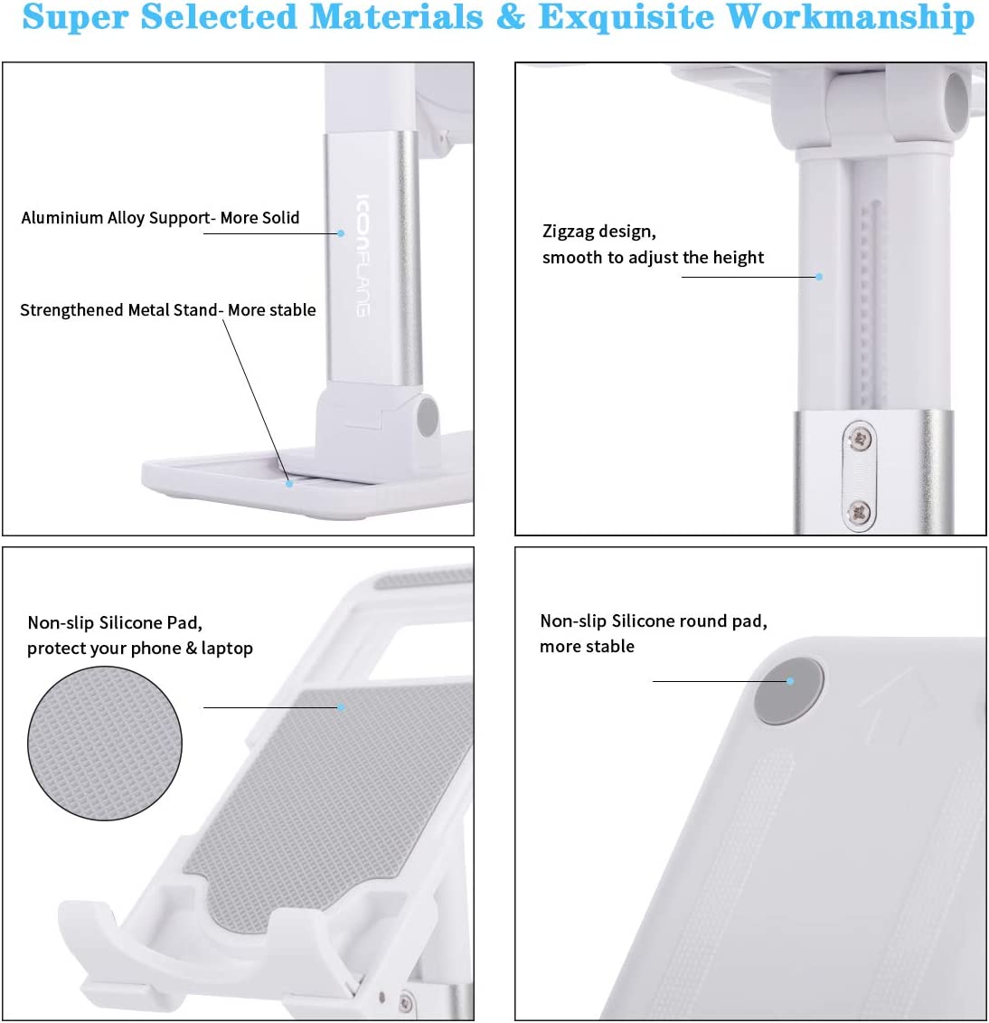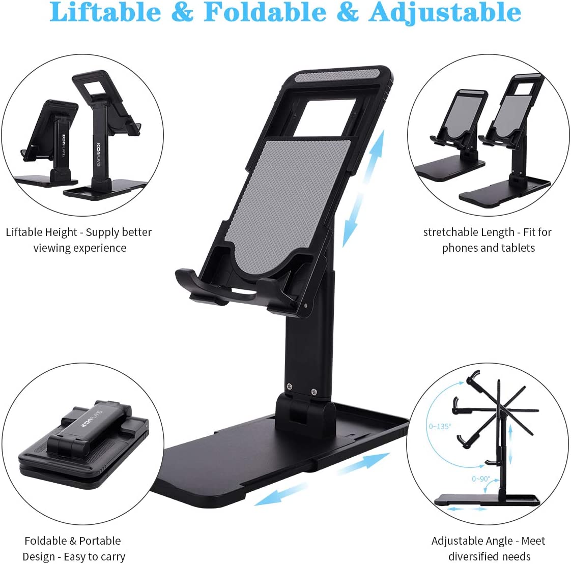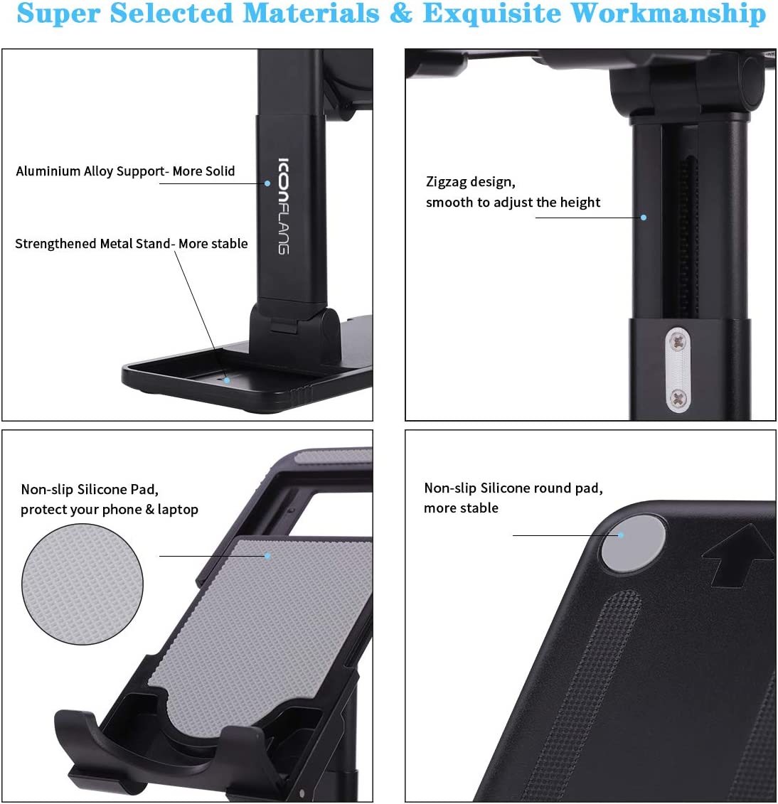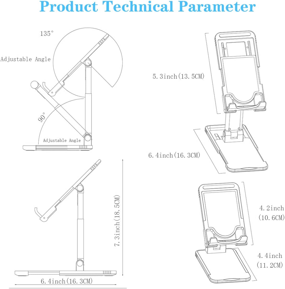 • 【ADJUSTABLE HEIGHT & ANGLE FREELY】The upgraded cell phone holder stand can easily adjust the height between 4.9-7.3 inch. The angle is adjustable between 0°~135°. It can free your hands while watching video, playing games, making phone call, viewing recipes etc. It is a good stand to offer you comfortable viewing angle, fix your posture and reduce neck & back strain.