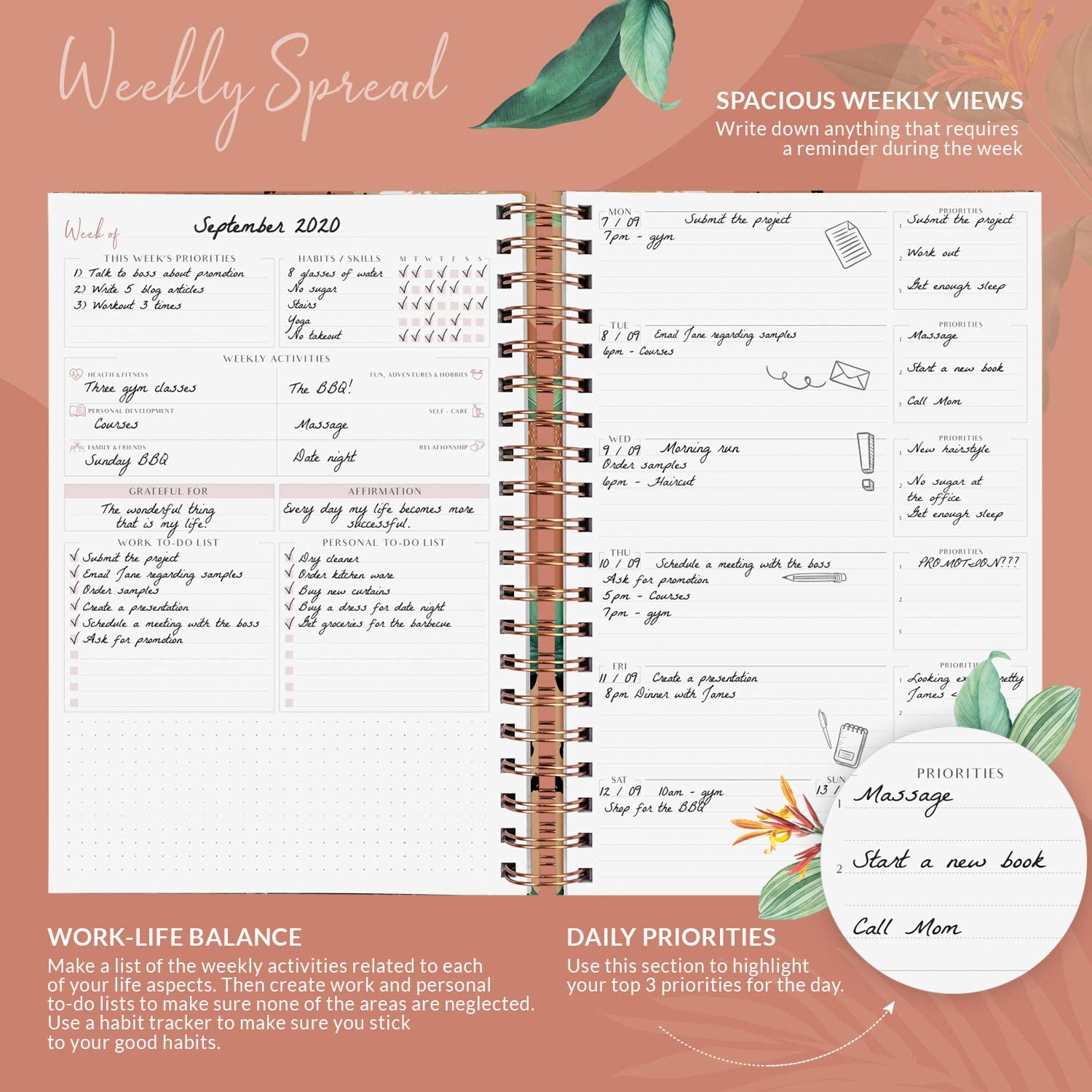 - ✓ BUILD A BALANCED & FULFILLING LIFESTYLE – With this time management planner, you will be able to not only plan your day-to-day life but also work on reaching your life goals and improving your work-life balance and overall well-being. You can do so by using goal-setting sections, habit trackers, monthly reviews, work-life balance areas, and separate work and personal to-do lists.