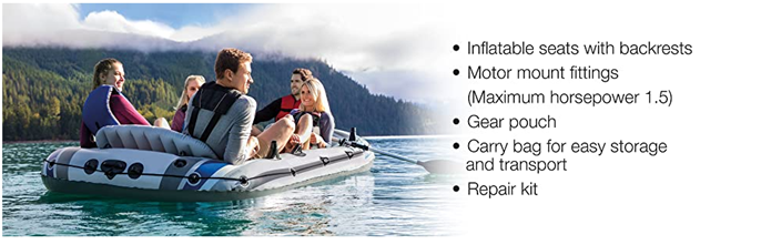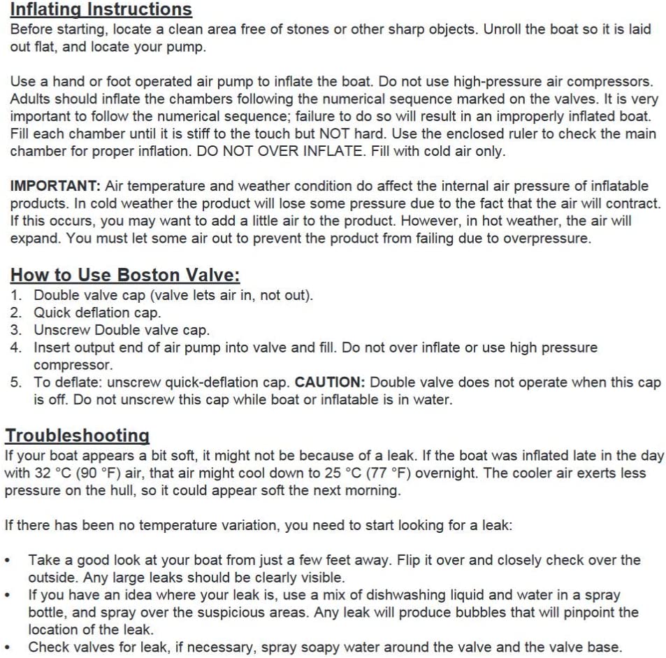 • ✔ READY FOR ADVENTURE: Great for boating or fishing with friends, this roomy Sports Series boat can fit five adults and has plenty of space for anything you need for a fun boating trip on lakes and mild rivers; NMMA and U.S. Coast Guard certified.ADVENTURE ACCESSORIES: Includes two 54-inch aluminum oars, two inflatable seats with backrests, heavy-duty grab handles with grab lines, two oar holders with welded oar locks, two quick-fill Boston valves, a high-output pump, and one repair patch kit