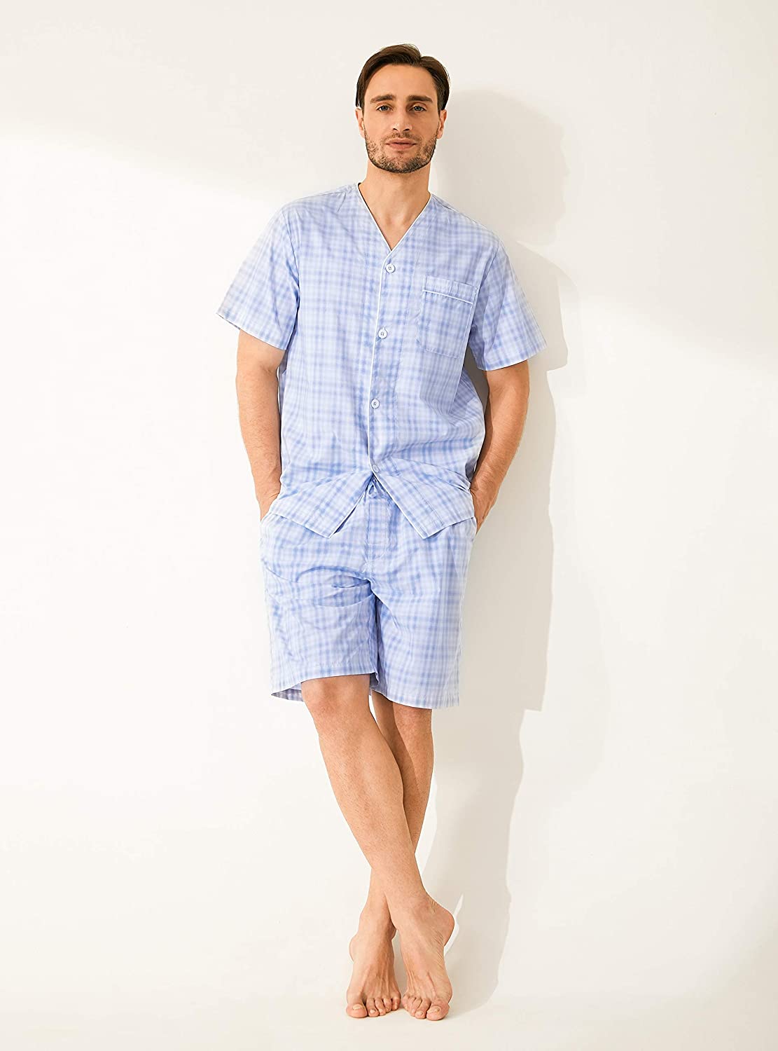 Premium Cotton Fabric Pajamas: 26S combed cotton top and 60S cotton bottom in woven texture are smooth soft, lightweight, moisture-wicking and comfortable for wearing